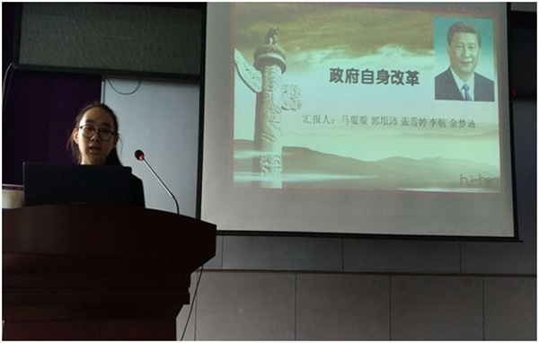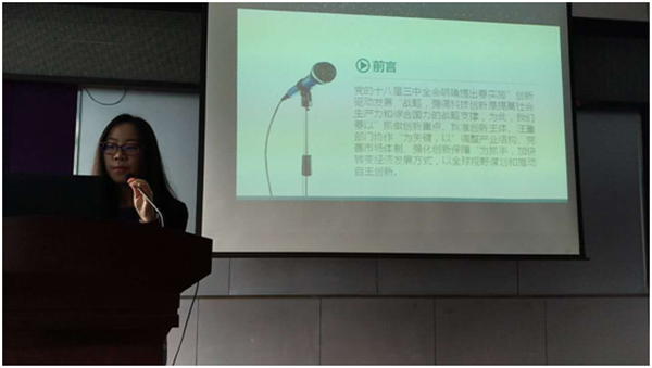 首先,同学们通过观看两会视频和访谈节目、阅览相关报道等方式,深入地了解两会内容,并对十大热点词发表了自己的见解。活动中,同学们遵循自行组队的原则,成立了十个“时事报道”小组。每个小组经过学习和准备,对两会十大热点词的提出背景、总体目标、具体实施方案等方面,进行了详细解读并向在场同学做了报告,让全体学生们对两会有了更加深刻全面的认识。十个小组以十大热点词:“十三五”规划、供给侧改革、扶贫攻坚战、慈善法审议、司法改革、民生改善、创新驱动、绿色环保、拓展空间和政府自身改革为主题,分别进行报告演讲。