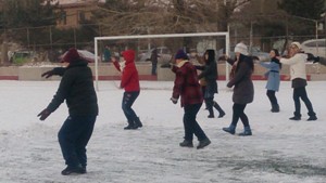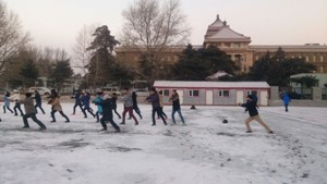 早晨七点天刚蒙蒙亮,新民校区的体育场内就可以看到老人们晨练的身影。有的在绕着操场跑步,有的在使用健身器材活动,其中最引人注目的是在操场正中央打太极拳的老人们。在得到老人们的同意之后,同学们便在老人们的身后自发的排好了队伍开始练习打太极拳。他们一遍又一遍的向老人们学习,老人们也一招一招地耐心指导。老人们对晨起锻炼的同学们表示了赞扬,但同时也希望他们能够持之以恒的坚持下去,锻炼身体磨练意志,这样才能成为祖国最坚实的脊梁。佩戴在同学们身上的党徽也在雪光的映衬下格外的耀眼。最后由于课业紧张,同学们晨练四十分钟后向老人们表达了诚挚地感谢,离开操场前往教室开始一天的学业。
