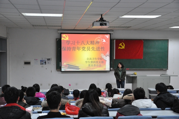 茶话会由观看党建纪录片《信仰——时代先锋行》拉开帷幕。片中介绍了站在时代前列的共产党员如何坚守心中信仰,如何带领人民建设社会主义现代化国家。大家观后受益匪浅,有些同学甚至几度落泪。接着,同学们从生活、学习、工作等方面,纷纷发表了对“信仰”的见解与体会。大家畅谈所想所思,现场气氛十分活跃。随后,学生第四党支部党员代表带领全体成员在党旗下重温入党誓词,感悟着作为党员的神圣感和使命感。大会最后,苏国范老师进行了总结。他指出,加强党性思想的交流利于推动学生第四党支部的建设与发展,并希望同学们严格要求自己,在学习、生活、活动等各方面创先争优,保持青年党员先进性,增强学生第四党支部凝聚力与战斗力。至此,此次茶话会圆满结束。