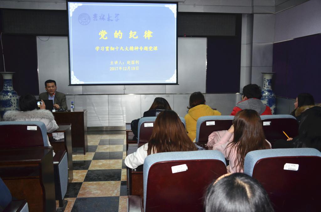 三楼报告厅主讲了以“党的纪律”为主题的专题党课,2015级、2016级全体学生党员及学生干部参加了此次学习。
