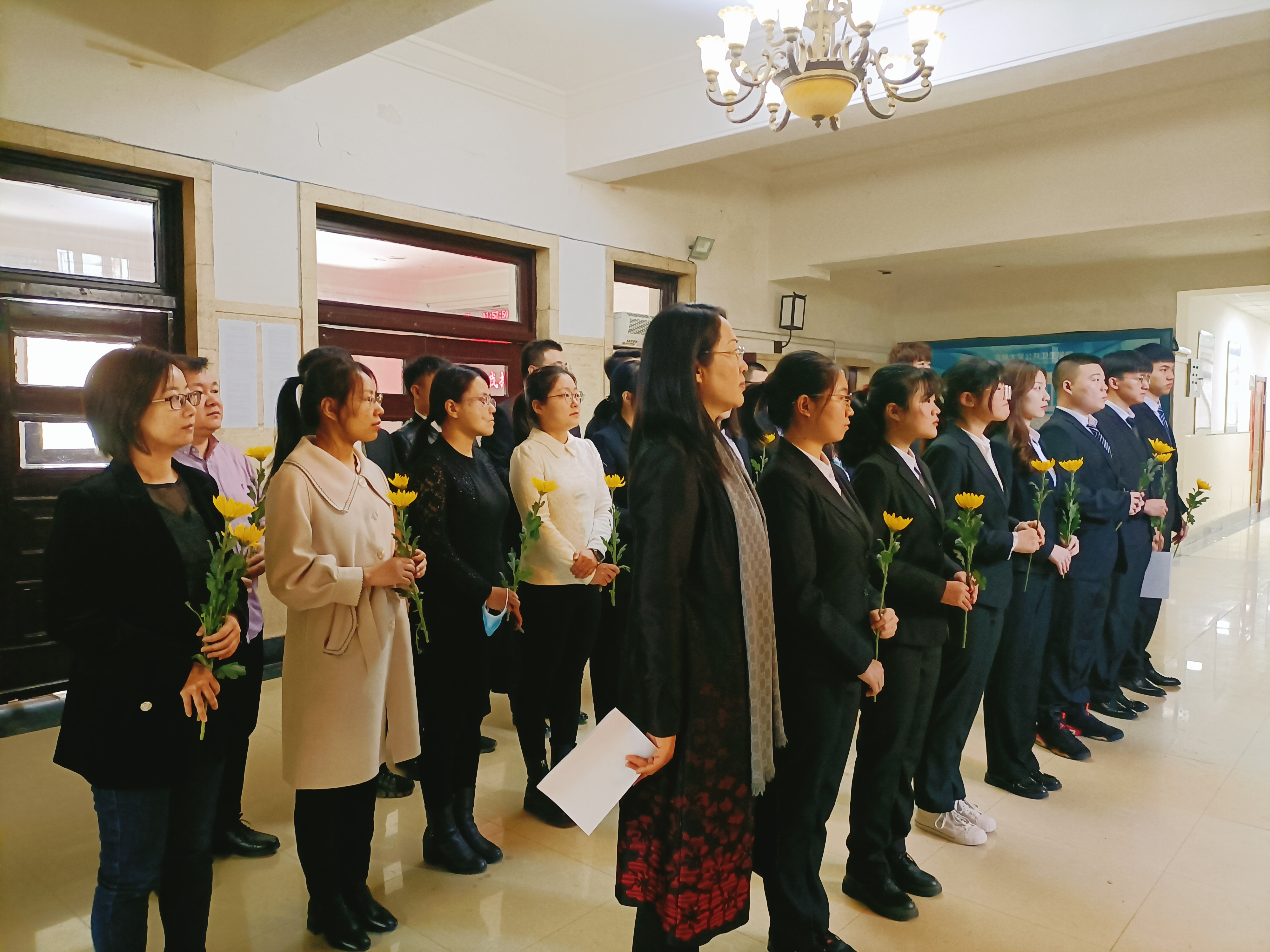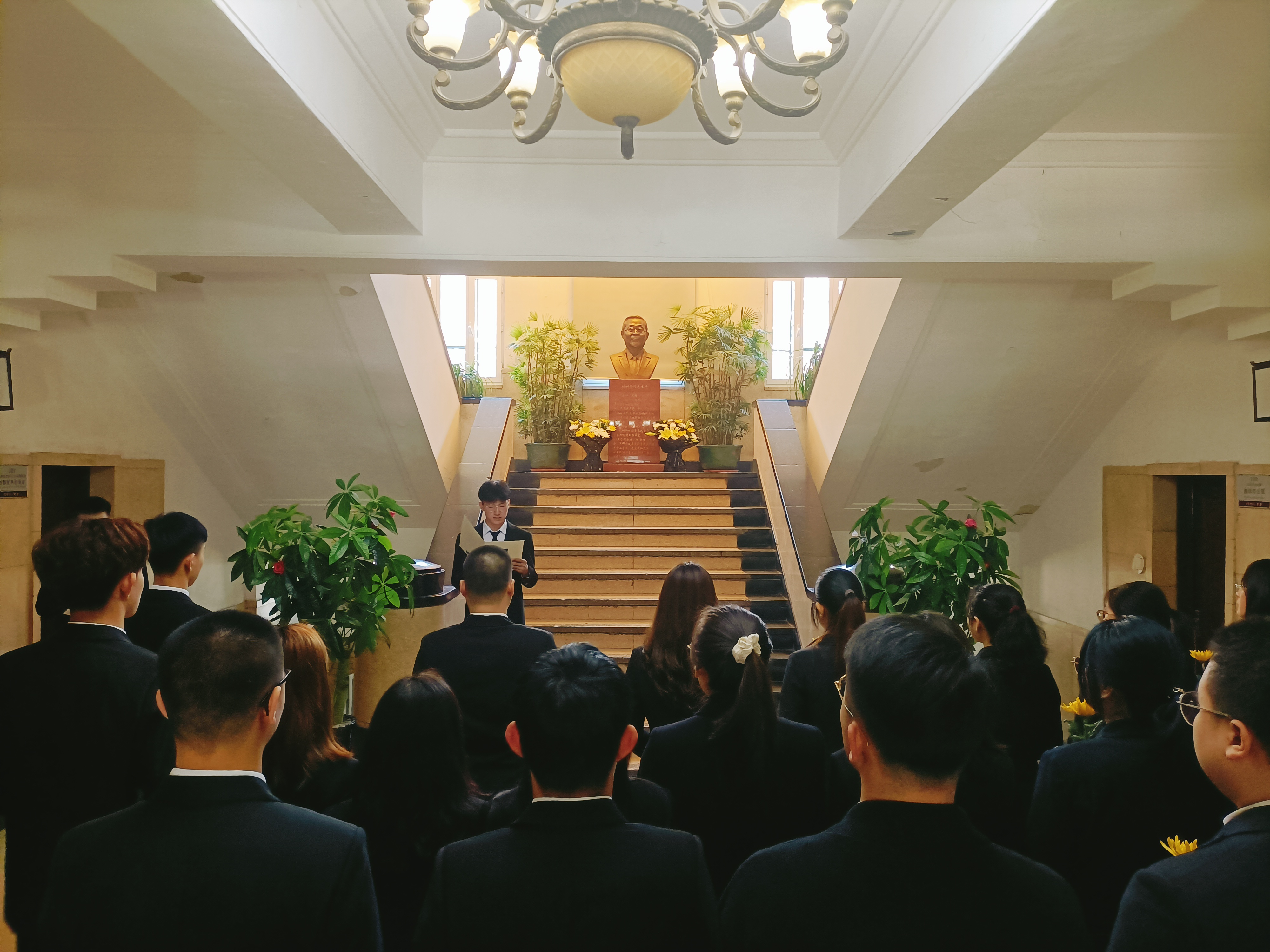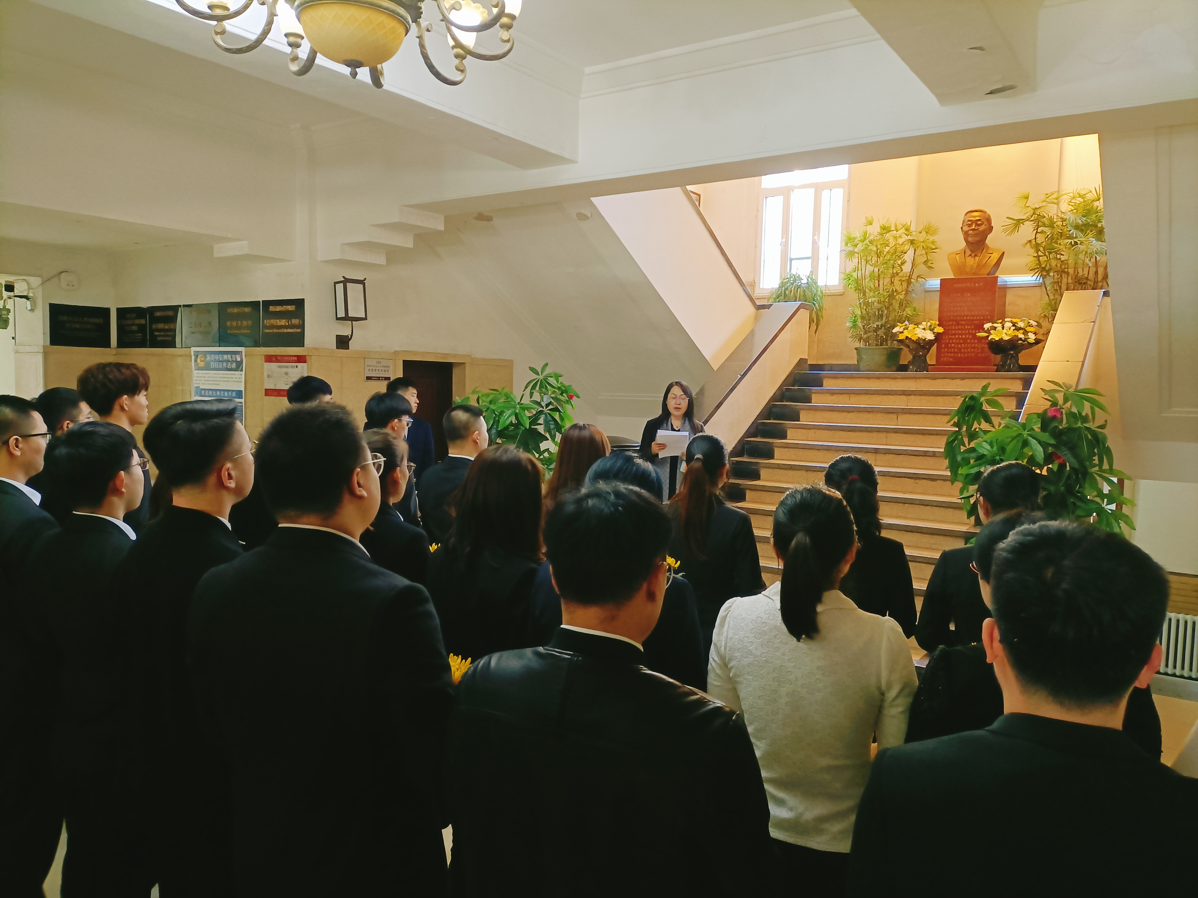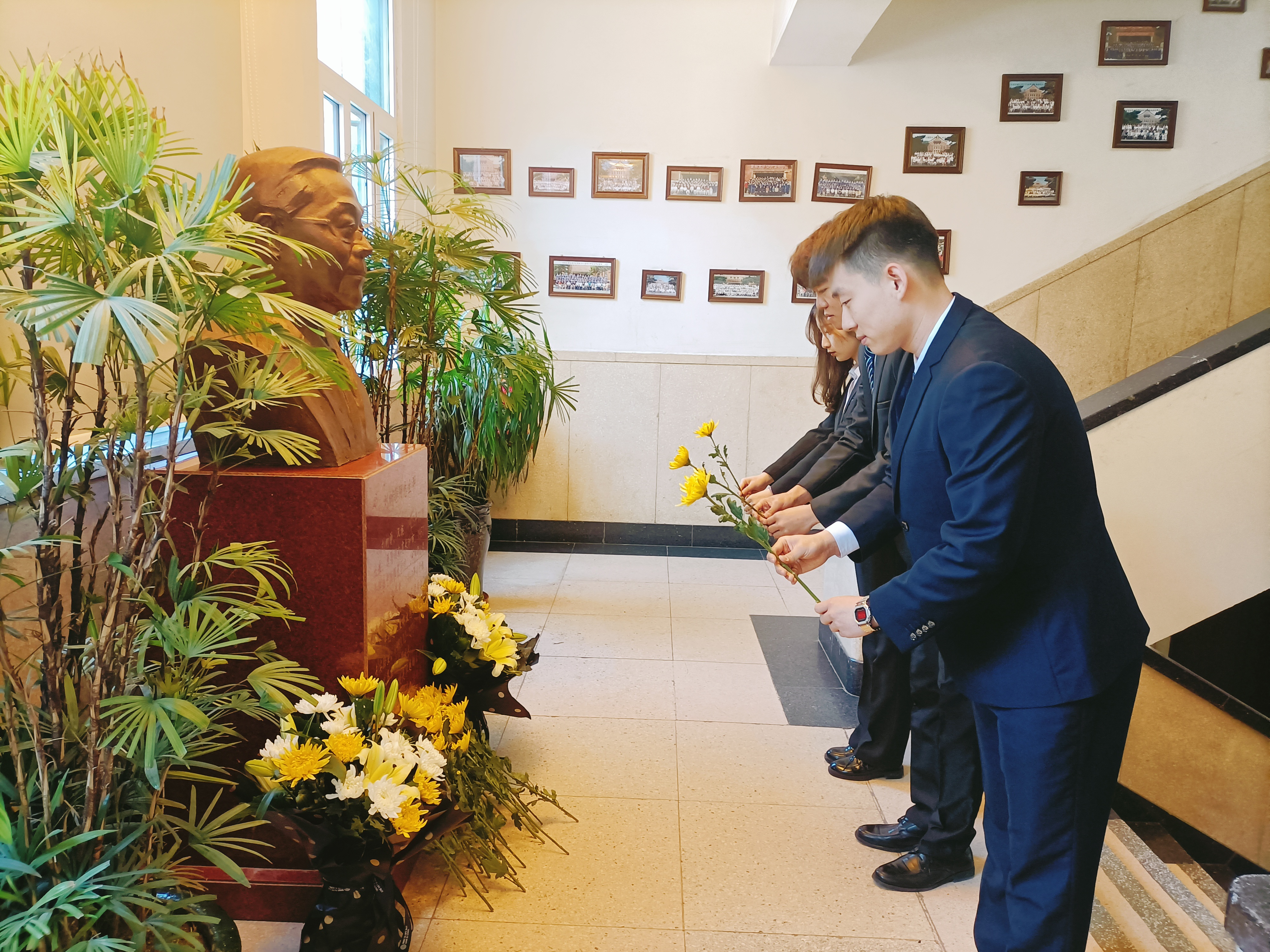 做出的突出贡献,情真意切的话语中流露出对刘树铮先生的缅怀之情,她勉励同学们向刘树铮先生学习,传承弘扬先生的精神风骨。接下来,由学生代表李智鹏同学发言,他从青年学生视角出发,为同学们讲述了他眼中的先生形象,号召青年学生应继承先生遗志,传承先生思想,为国家公共卫生和放射医学事业奉献终身。发言结束后,学生代表上前祭扫了刘树铮先生雕像。祭扫完毕,全体师生代表依次来到刘树铮先生雕像前庄严鞠躬并敬献花束。