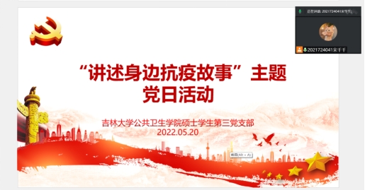 为进一步弘扬伟大抗疫精神,大力宣传身边党员和师生在疫情防控工作中的先进事迹、感人故事与崇高精神,不断增强广大党员归属感、荣誉感和使命感,持续培育、挖掘和丰富吉大精神新内涵。2022年5月20日包你发 硕士学生第三党支部组织开展“讲述身边抗疫故事”主题党日活动。此次活动共27名党员和预备党员参加,由战勇智、唐志滔和岳宝丽三名党员同志讲述了疫情期间作为长春市疾病预防控制中心志愿者的抗疫故事。