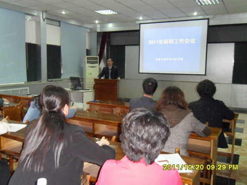 科研工作做了汇报,并有针对性的对各类项目的申报、在研项目的运行管理做了具体分析和说明,对教师提出了科研工作的具体要求和工作部署。要求全体教师从现在开始就要为2012年的国家自然科学基金的申报工作进行积极准备。