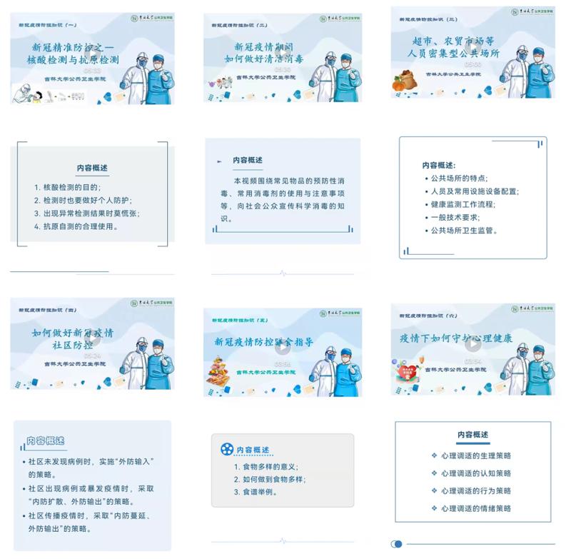 科普视频共分为六期,向社会公众宣传了核酸检测与抗原检测、清洁消毒、公共场所和社区疫情防控、疫情期间膳食指导和心理健康指导等疫情防控相关知识。视频兼具专业性和科普性,既深入浅出,又通俗易懂,在包你发