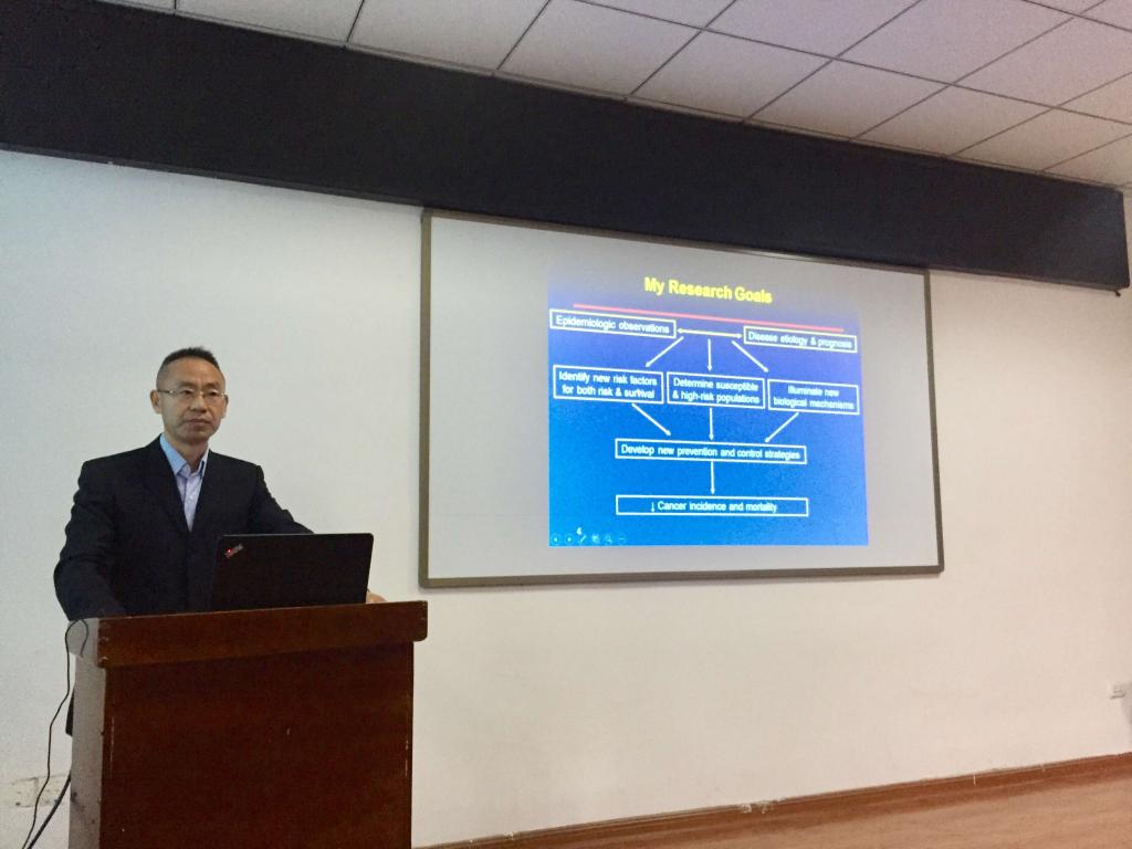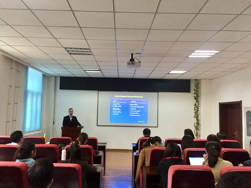 活动期间,张学宏教授和参会者分享了基于哈佛大学队列产生的一些研究结果及其对今后肿瘤的预防和预后举措的影响。作了题为“基于前瞻性队列的常见与罕见肿瘤的流行病学研究” 的学术报告。近几十年来,随着社会的发展,人们的饮食习惯与生活方式也产生了空前的变化。饮食、生活方式与每个人都息息相关。随着肿瘤发病率和死亡率的增加,越来越多的医学研究者试图探寻饮食和生活方式与肿瘤发病和预后之间的联系。报告先介绍了哈佛大学创建的著名护士队列 (the Nurses’ Health Study 1 & 2)和男性队列 (the Health Professionals Follow-up Study)数据情况,随后详细、深入地探讨了大肠癌、肝癌的最新研究进展。张学宏教授的报告语言通俗风趣,内容丰富新颖,开阔了现场师生的学术视野,收到了大家的一致好评。