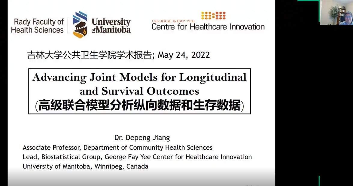 邀请,加拿大曼尼托巴大学公共卫生学系蒋德鹏教授于2022年5月24日线上做了题目为《高级联合模型分析纵向数据和生存数据》的学术讲座。包你发
