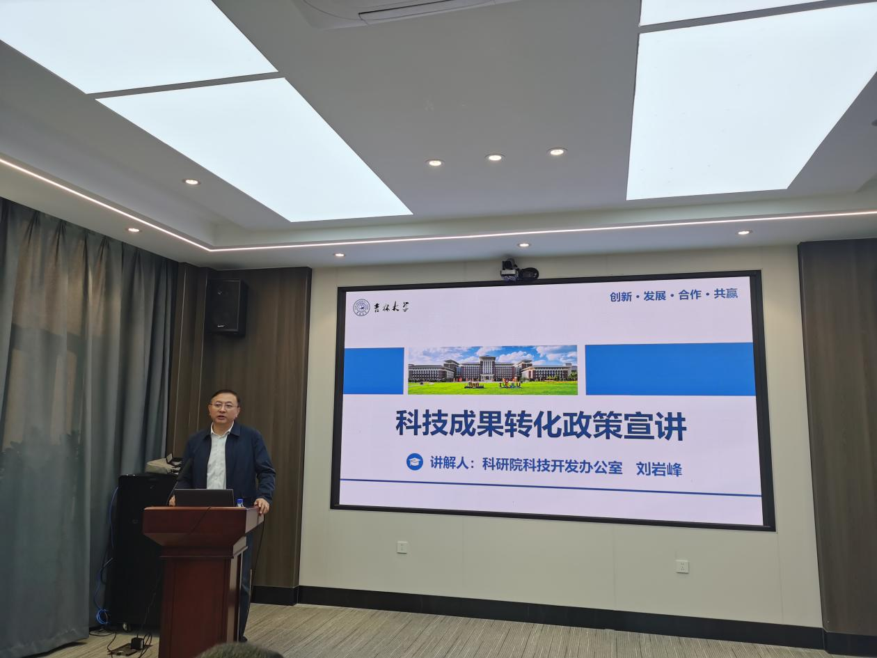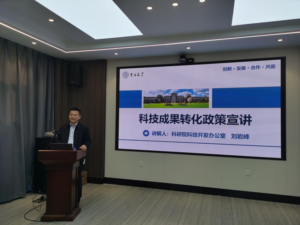 邀请科研院副院长兼科技开发办公室主任、国内合作处处长刘岩峰作科技成果转化政策宣讲会,技术转移科科长徐婉、朱梓瑞老师、包你发