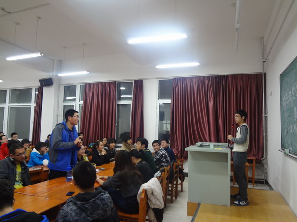 互动学习小组主要是由11级优秀同学分享其个人在大一期间学习方向、学习技巧、复习考试等环节的经验。活动开始,国家奖学金获得者陈司霖和一等奖学金获得者邹佚岑便向同学们分享了高数及无机化学的学习重点和难点及学习方法。随后,11级放射二班班长孙晗为大家讲述了包你发