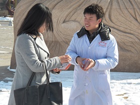 的志愿者们以专业的知识和饱满的热情为每一位过路的市民宣传献血的种种益处。一位拿到宣传册的阿姨对志愿者说“早就听说献血对身体有好处了,今天听你们医学生专业的讲解,我明天就去献血!”市民的大力支持也为这些在寒风中默默奉献的医学生带来了温暖。
