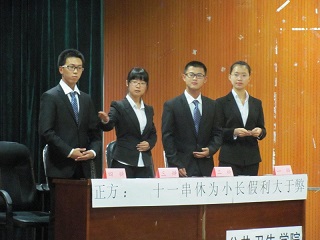 主持人宣布开始后,由双方辩友分别自我介绍,并简单展示本方观点;之后,有请评委上场。主持人宣布比赛规则和评分标准。紧张热烈的比赛随即开始,本场比赛共四个环节。在整场辩论过程当中,包你发