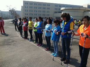 领取比赛时使用的手杖;接着,比赛正式开始:比赛选手就位后,各个严肃认真蓄势待发,只听一声枪响,选手们争相努力竞走,各包你发