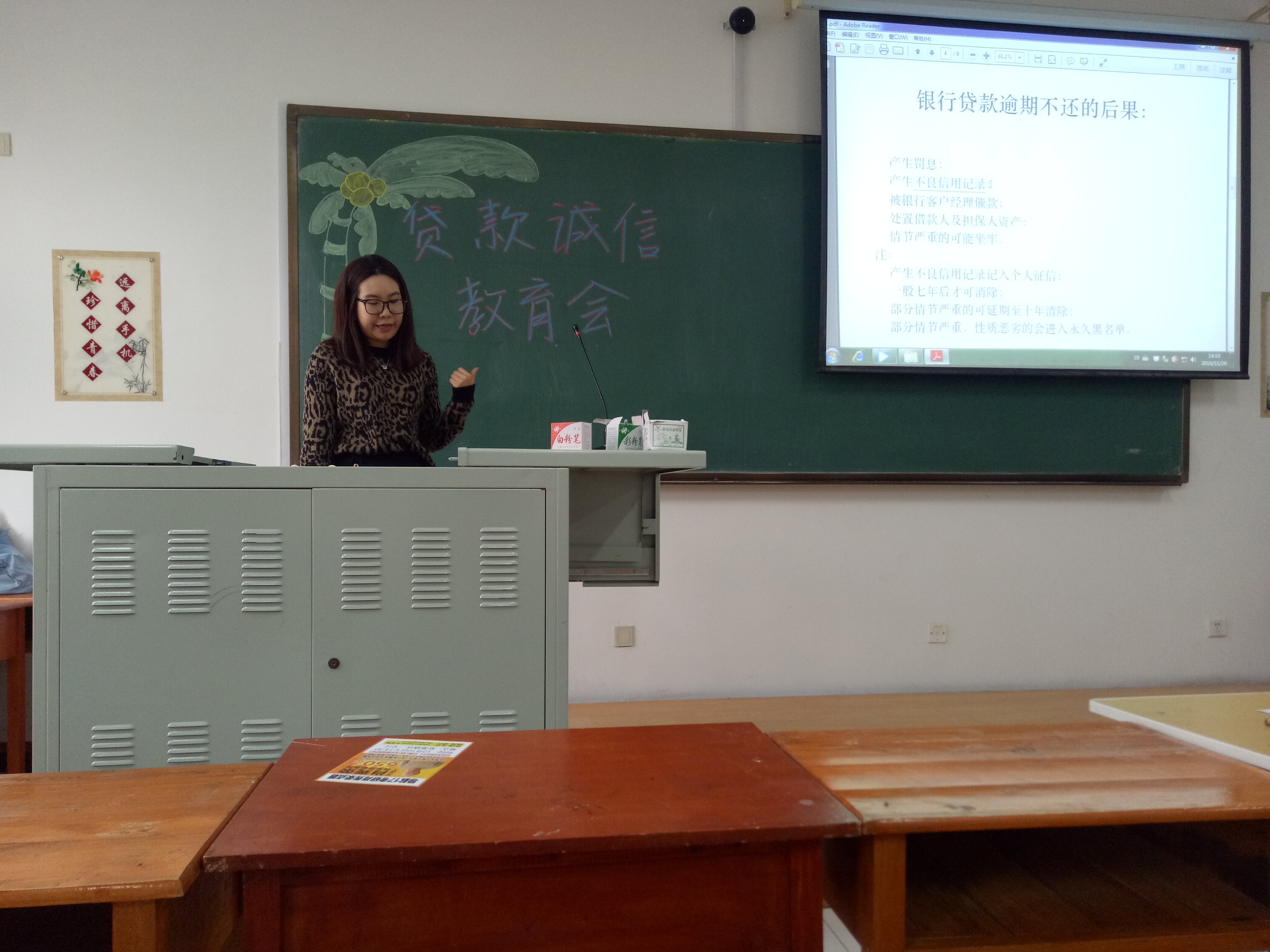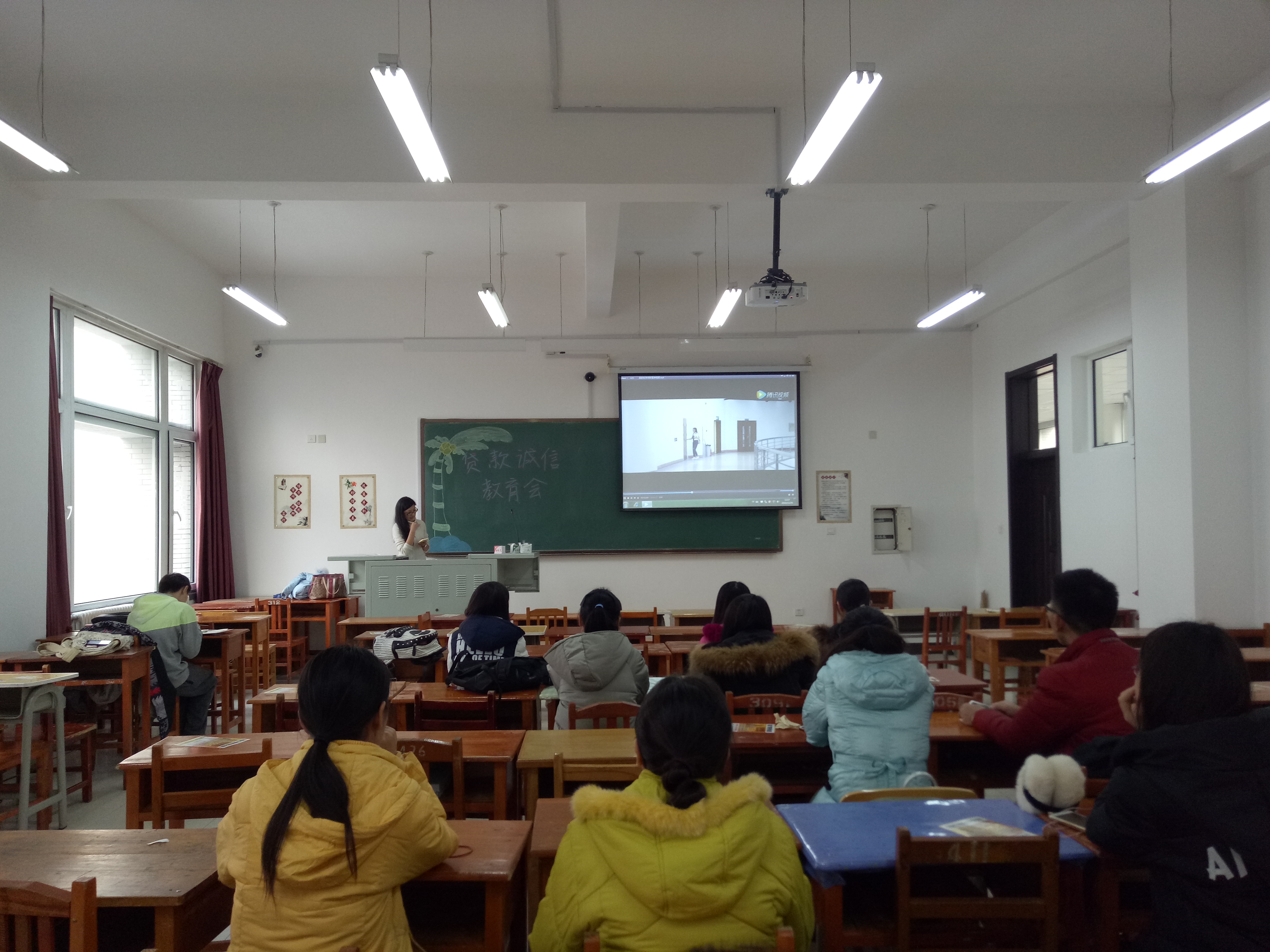 于中心校区李四光楼314教室举行了学生贷款诚信教育会。活动有幸邀请到中国银行刘营女士为同学们讲解关于校园地贷款的相关事宜,包你发