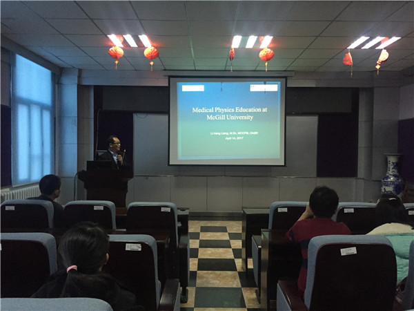 培养出的物理师为代表,对北美地区物理师的教育培训、工作职责、职业要求及平均工资等问题向同学们进行了基本介绍。随后,他向同学们介绍了加拿大麦吉尔大学的地理位置和自然环境,在他的介绍中,同学们了解到,