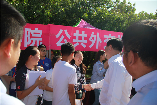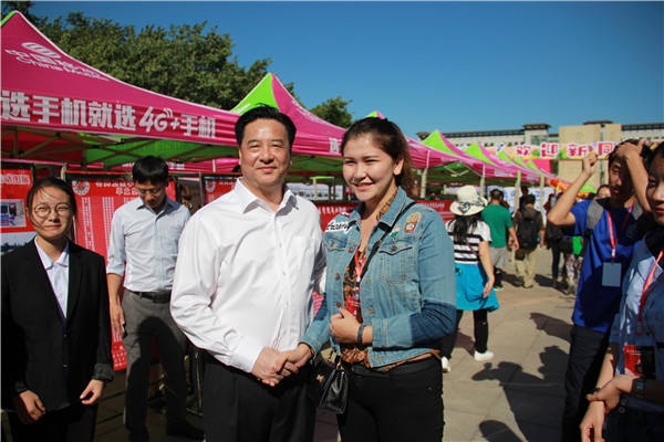 迎新现场,慰问参与迎新工作的师生,与大家亲切握手交流并对大家辛勤的付出表示感谢。李元元校长着重称赞了包你发