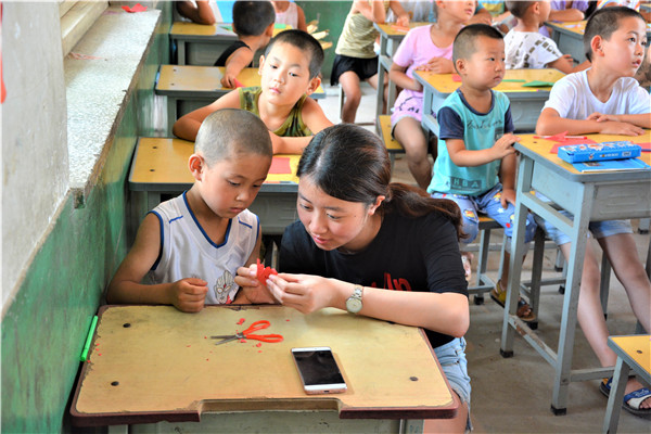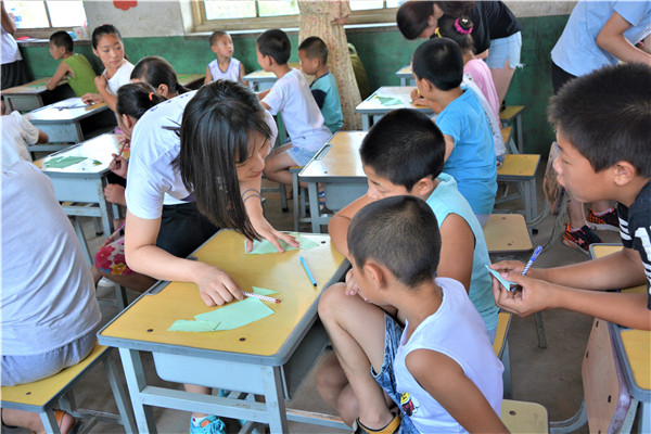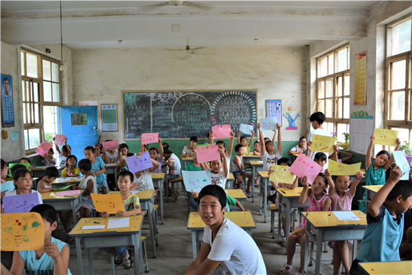 下午的教学活动中,志愿者通过启发的方式,鼓励小朋友们给父母写一封信,表达自己对他们的感恩与爱。大部分小朋友很快就开始动笔,刷刷地在纸上写着,但也有少数小朋友抓耳挠腮,志愿者和他们进行了进一步交流,发现这些小朋友的父母大多离开村子,到大城市去打工以贴补家用,像我们在新闻中了解到的外地务工人员一样,一年回家的次数屈指可数。这些“留守儿童”对他们父母既充满了思念,又委屈于没有父母的时时陪伴,有的小朋友的泪珠还打湿了稿纸,让志愿者们的心难过地揪在了一起。对这些孩子,是既心疼,又无奈。书信课的最后,志愿者向表现出色的孩子赠送了包你发