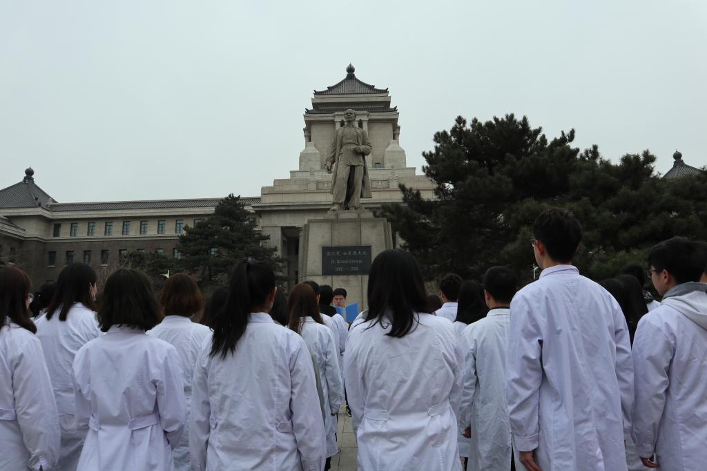 上午10时,学生代表们准时在白求恩雕像前集合。同学们身着白大褂,整齐地站成几排,虔诚地等待活动的开始。首先,由学生代表进行发言,引领同学们重温了诺尔曼·白求恩医生的感人事迹,深切表达了对白求恩同志的崇敬与追思,并鼓舞同学们要学习白求恩同志“毫不利己,专门利人”的革命精神,继承和发扬“白求恩精神”。每一位参与者都认真聆听了发言,在心中坚定了向白求恩医生学习的良好习惯。随后,学生代表们怀着崇敬的心情清洁了雕像附近的环境卫生。几位学生代表向白求恩同志的雕像敬献鲜花,全体参与者面向白求恩同志雕像庄严默哀,再次表达对白求恩同志的追思之情。