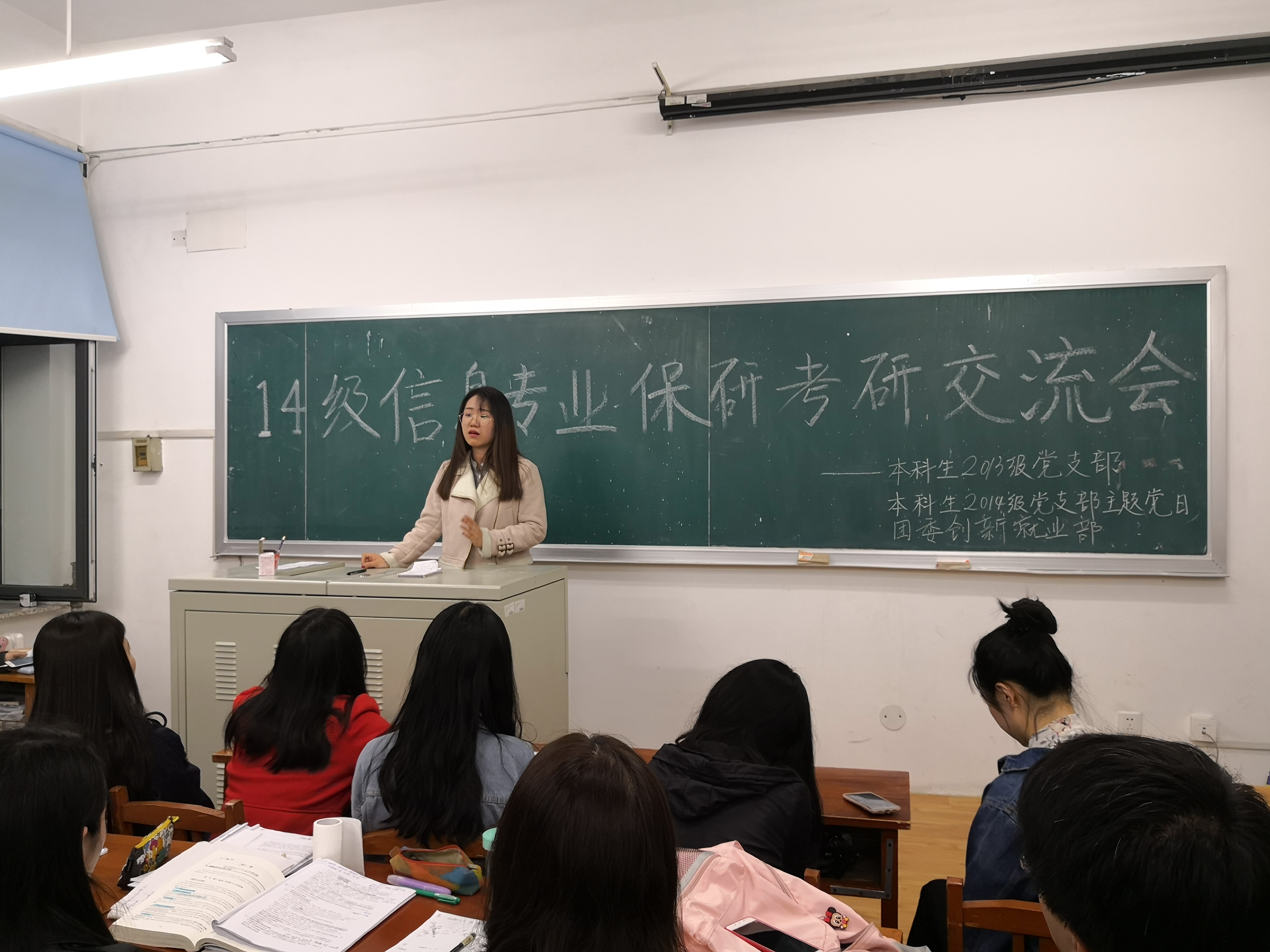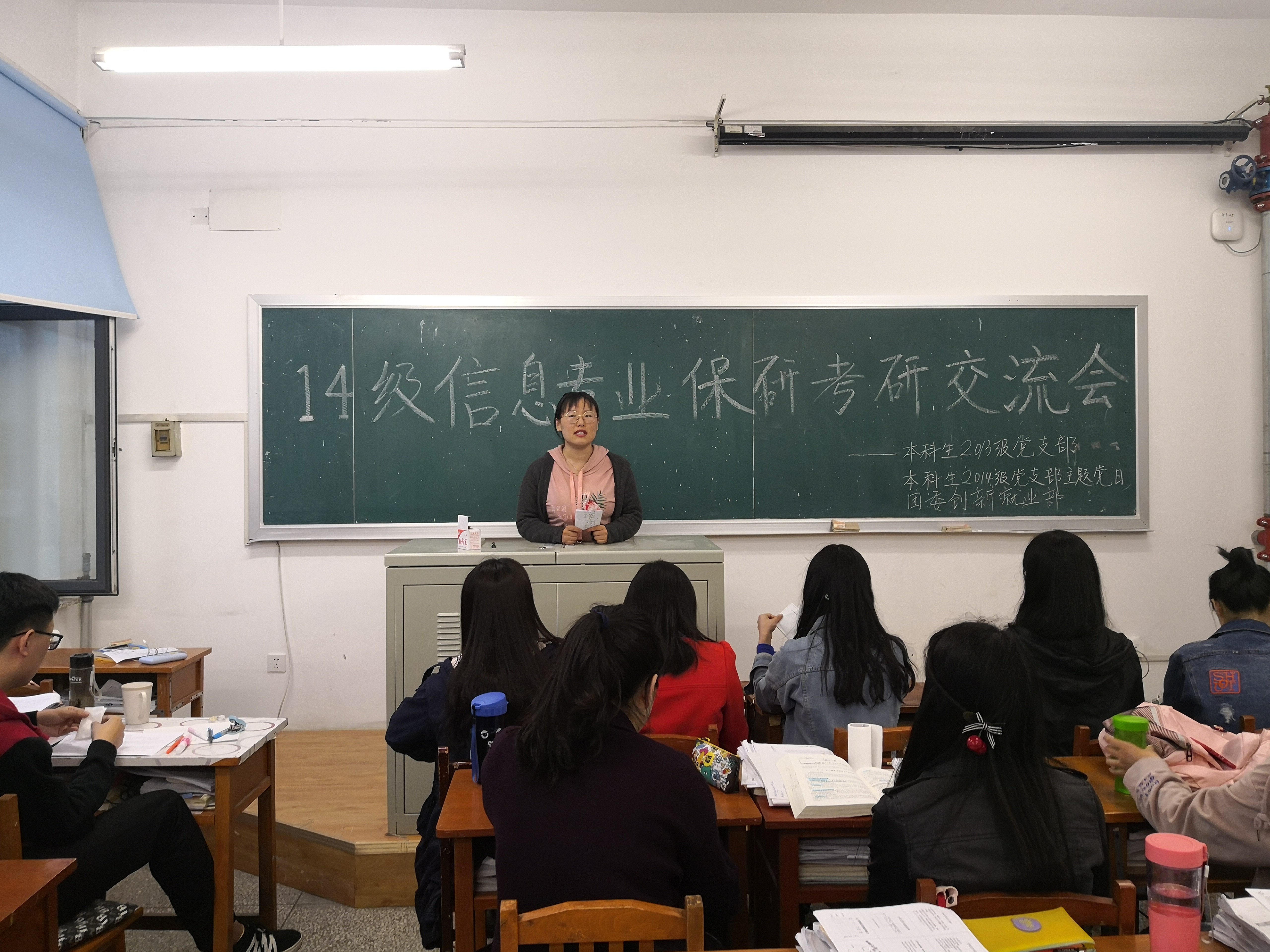 团委创新就业部于新民校区第一教学楼404教室联合开展了针对2014级医药信息管理专业本科生的保研、考研经验交流会。2014级医药信息管理专业全体同学、2015级和2016级部分同学参加了此次会议。同学们热情高涨,表现出了大家对考研、保研相关事情的重视。