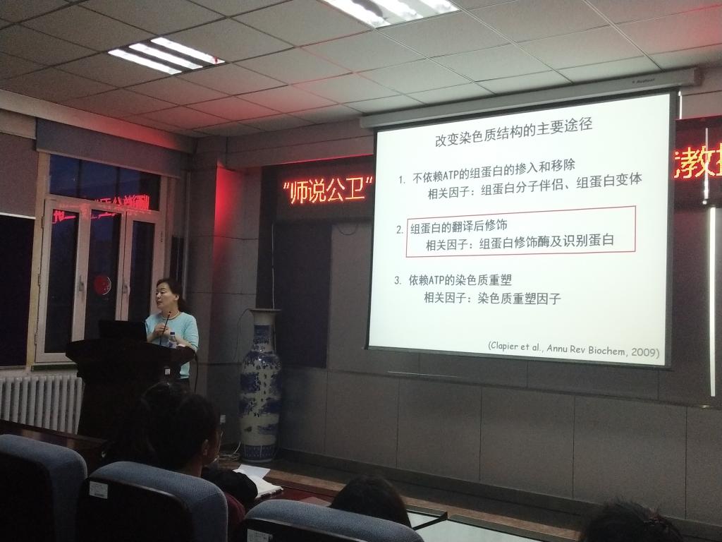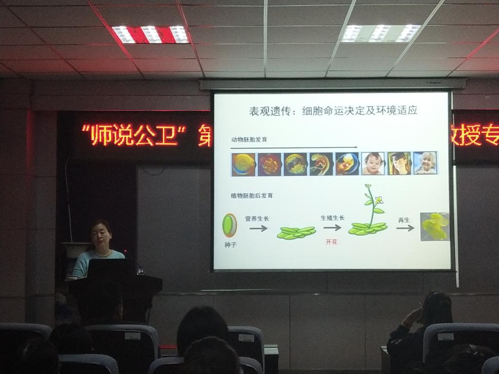 三楼报告厅座无虚席,简短的开场之后,讲座正式开始。讲座中,董爱武教授详尽地介绍了改变染色质结构的主要途径,包括不依赖ATP的组蛋白的掺入和移除、组蛋白的翻译后修饰、依赖ATP的染色体重组。她还讲解了表观遗传学的核心研究内容,包括DNA甲基化修饰、染色质结构变化、非编码RNA调控等,并以此为基础,围绕组蛋白甲基化修饰阅读蛋白精确调控拟南芥开花时间的分子机制展开深入、直观的分析。随后,董爱武教授还将表观遗传学联系到动物胚胎的发育过程中展开讨论,通过演示文稿上直观、简洁的画面,绘声绘色地向同学们讲解了专业知识。台下的同学们聚精会神地聆听着教授的讲座,在演讲的关键之处,不时地认真记录下了讲座中的精华。