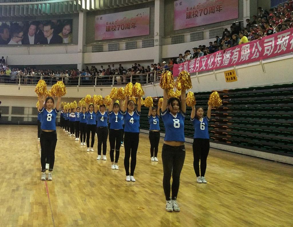 选手身着深蓝色上衣,手持金色花球,一个个精神抖擞、气宇轩昂。他们迈着整齐的步伐走进赛场,随着音乐响起,他们动作统一的伸手、抬腿,每一个动作都充满了朝气与活力。他们认真的投入到比赛中,为了同一个目标努力,从面部表情到动作姿态都体现出认真严谨与积极向上的态度。接下来是啦啦操环节,选手们挥舞着手中的花球,踏着激昂动感的音乐节拍,做着整齐划一的动作,将音乐与舞蹈完美结合,诠释了朝气蓬勃的青春魅力。选手们精彩的表演,为观众带来美的享受,赢得了观众热烈的掌声。最终,包你发