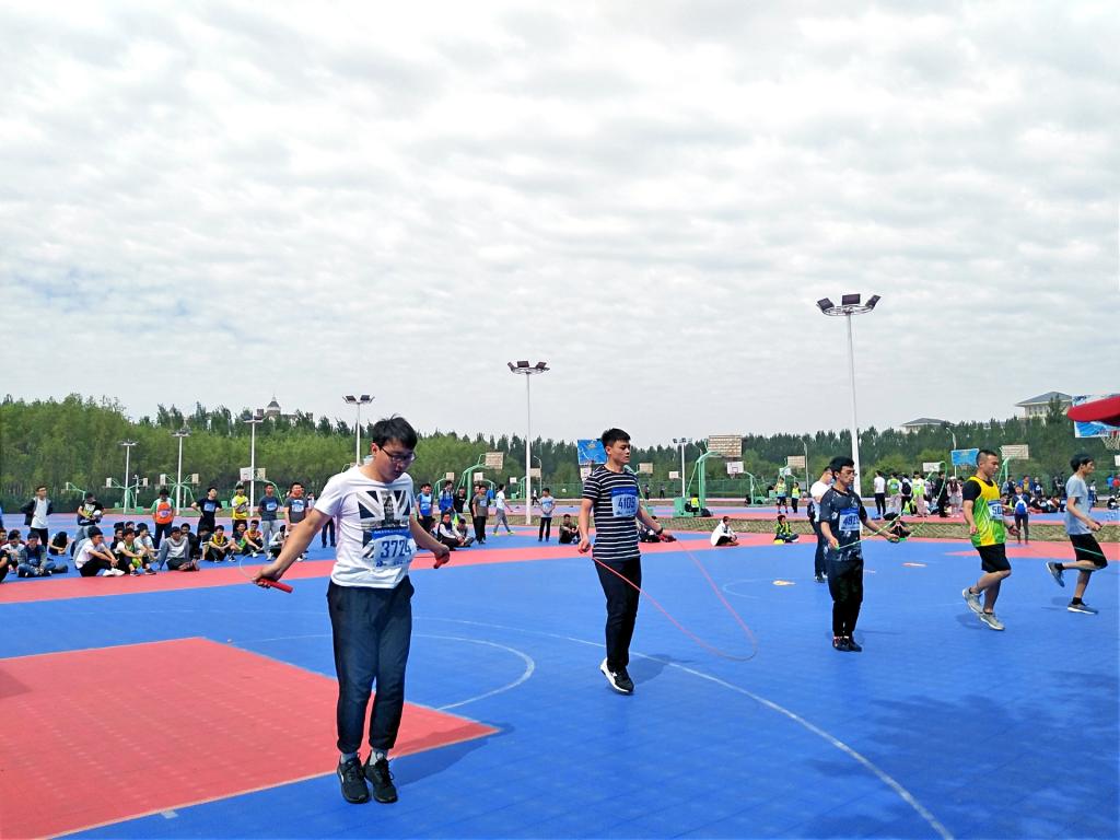 的选手上场。他们拿好绳子,摆好姿势,一切准备妥当。裁判员一声令下,只看到他们双脚腾空,甩动的绳子在空中留下美丽的弧线。一分钟跳绳比赛是根据在规定时间一分钟内累计所跳次数多少决定名次,这不仅仅考验运动员跳绳技巧的高下,更考验着他们跳绳速度的快慢。在速度与时间的较量下,参赛选手都争分夺秒,互不相让,比赛十分激烈。此时天气有些阴沉,黑云压空,但这丝毫不能影响运动员对于比赛的热情与必胜的信心,依旧精神充沛,以最好的状态迎接比赛。比赛结束了,虽然包你发