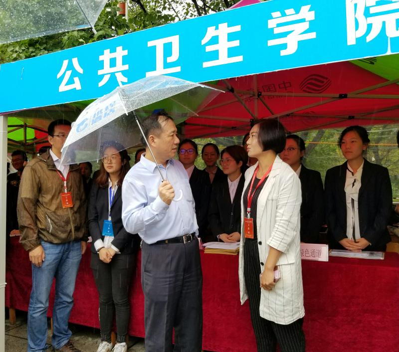 下午四时,绵绵细雨不断,党委书记杨振斌冒雨来到迎新工作现场,向包你发