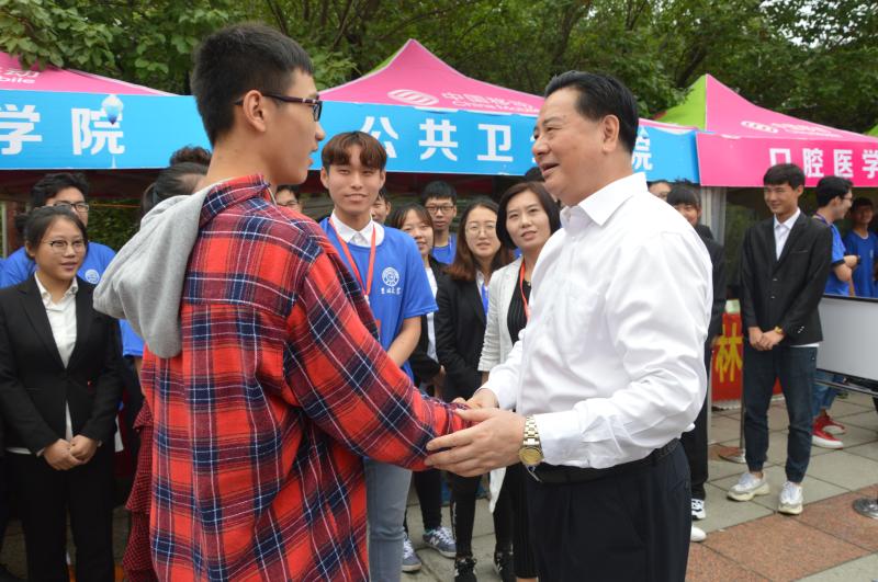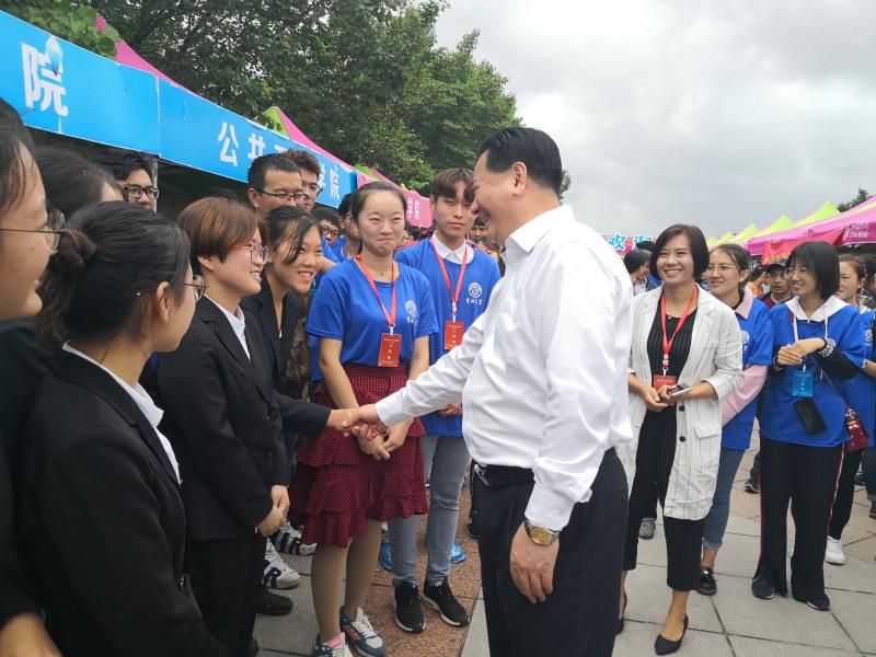 迎新现场,慰问参与迎新工作的师生,与大家亲切握手交流并对大家辛勤的付出表示感谢。一名刚刚办理完入学手续的新生想与校长合影留念,校长欣然同意并热心询问他入学报道的情况。此外,校长还叮嘱新生和志愿者们雨天要注意保暖,以防生病。随后,李校长在了解迎新工作的基本情况之后,对包你发