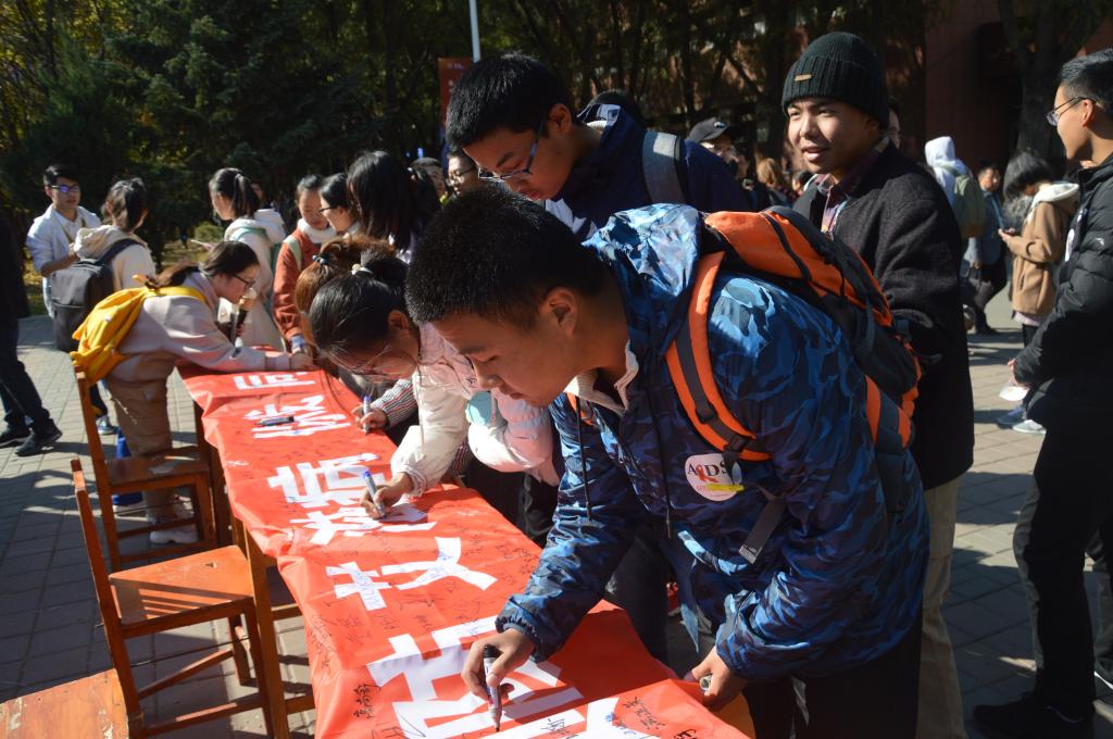 同学们发放艾滋病知识宣传手册。中午十二时,活动正式开始,陆续来到活动现场,在工作人员的带领下戴上了防范艾滋病的标志徽章,并在宣传条幅上签名以表示对祖国“防艾”事业的支持。随后,工作人员引导同学们观看了展板上的艾滋病相关知识,并正确客观地解答了同学们的疑问。由于本次活动形式新颖、内容充实,也吸引了许多外国友人参与。活动最后,同学们与工作人员共同在展板前合影留念。