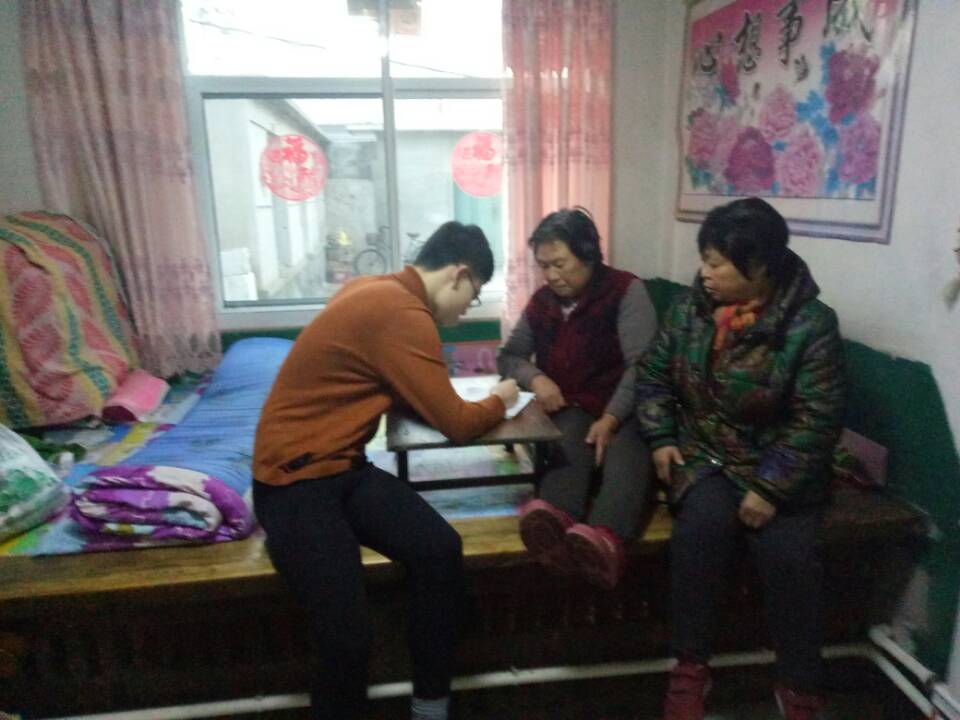 社团联合会副主席、2016级预防医学专业本科生曲景辉的组织下,9名2016级本科生借寒假返乡之机,在辽宁大连、广西桂平、甘肃天水、山东济南、广东深圳、湖北黄冈、河北保定等9省11市进行入户调查和访谈,了解60周岁以上老年人的生活习惯和慢性病患病情况。