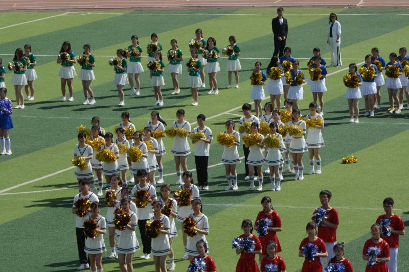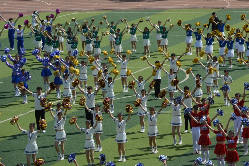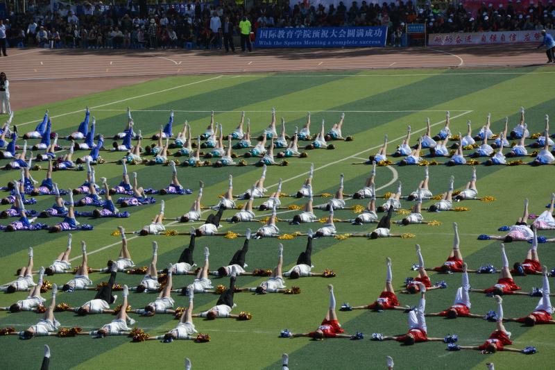 广播体操、啦啦操表演队伍上场,她们舞动花球,迎风奔跑,形成了一条七彩波浪。