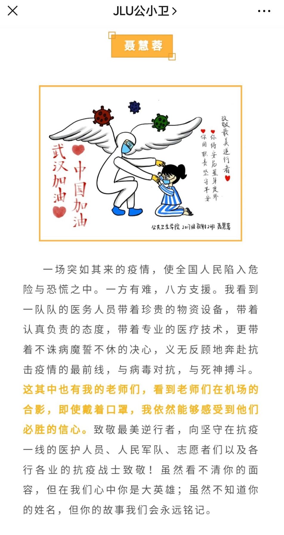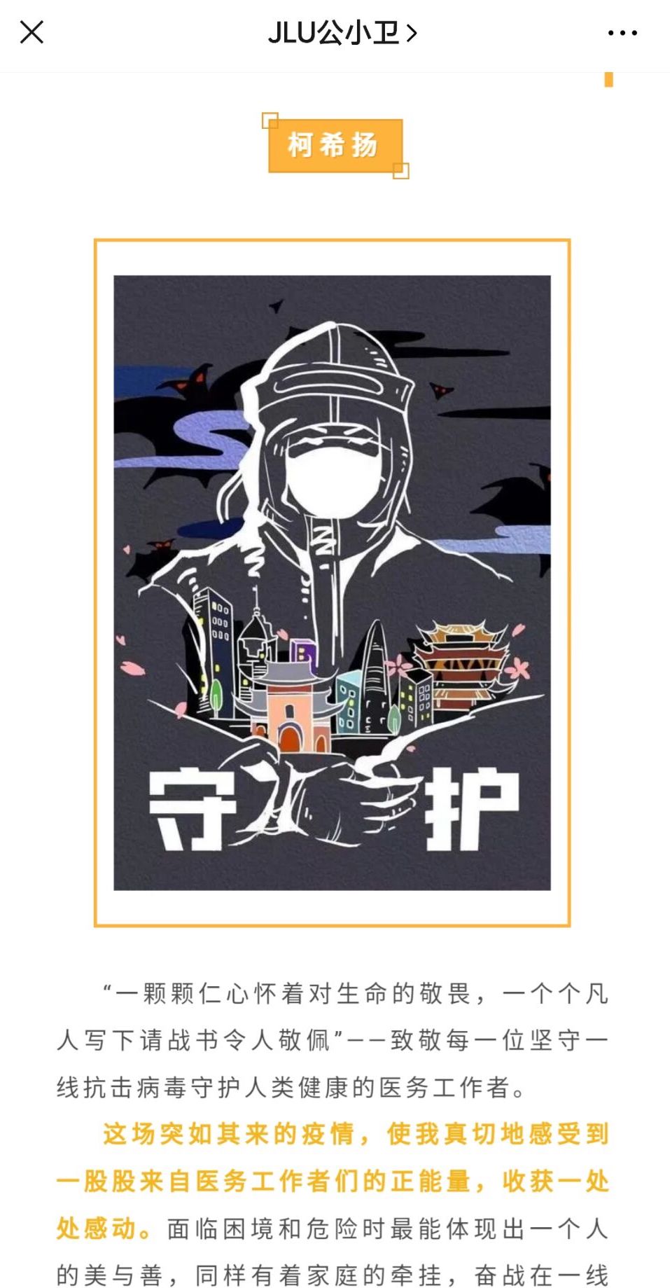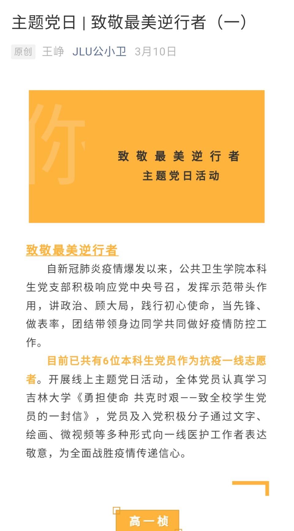 公众号JLU公小卫上。这些作品秉承着“疫情就是命令,防控就是责任”的信条,传递出党员们对各行各业抗疫战士的敬意与感谢,也表达了作为医学生“不忘初心,牢记使命”的责任与担当,获得了同学们的由衷赞美与一致好评。在线上,党员们还认真学习了包你发