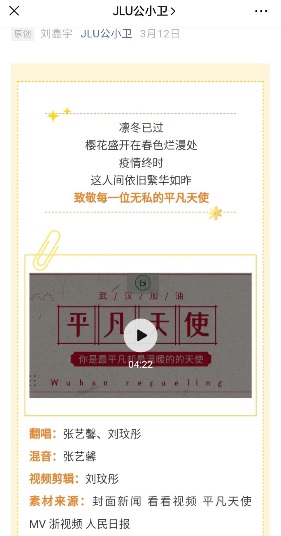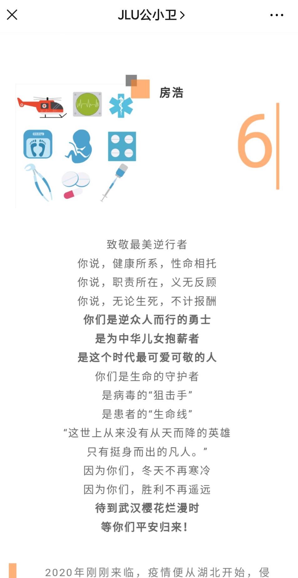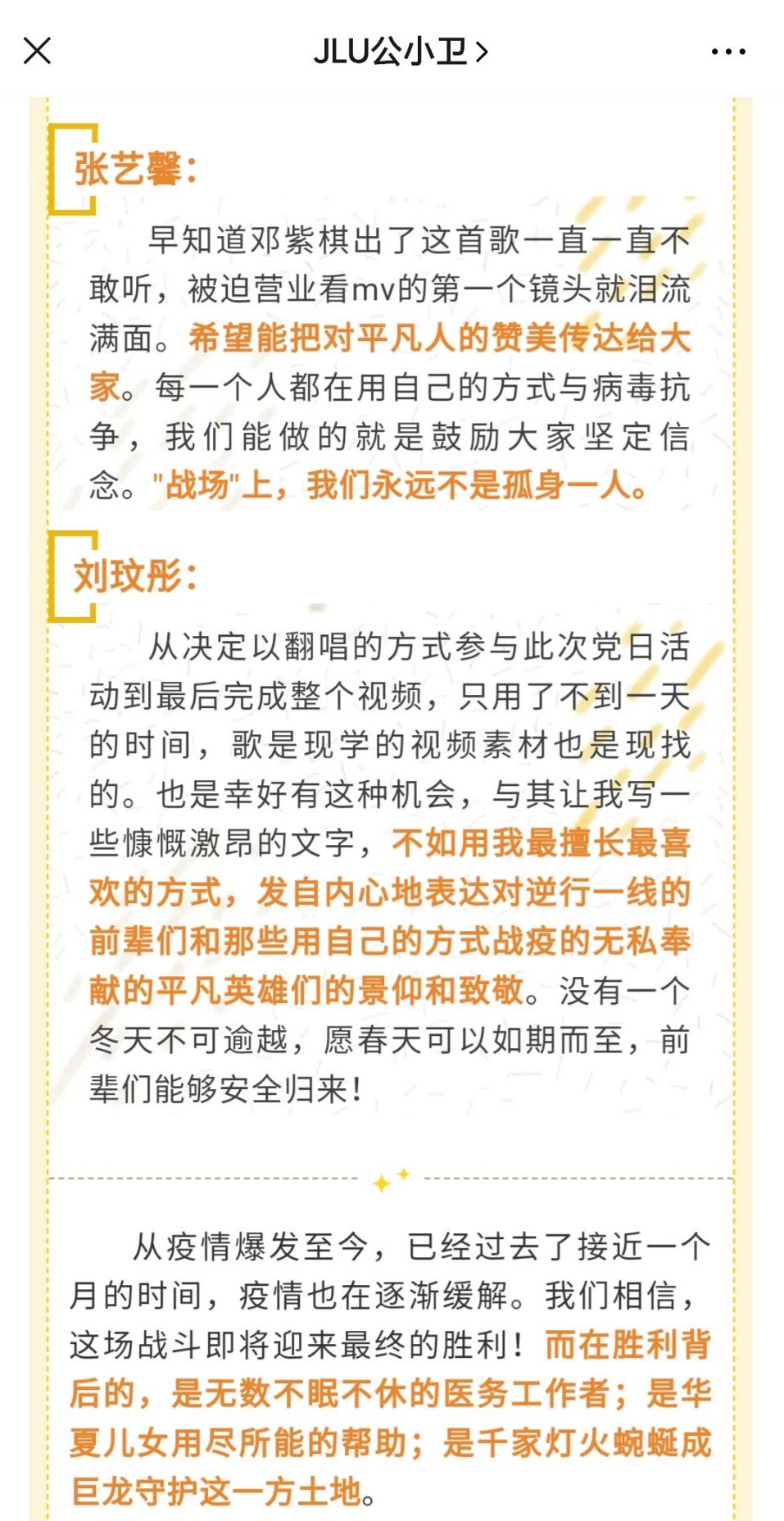公众号JLU公小卫上。这些作品秉承着“疫情就是命令,防控就是责任”的信条,传递出党员们对各行各业抗疫战士的敬意与感谢,也表达了作为医学生“不忘初心,牢记使命”的责任与担当,获得了同学们的由衷赞美与一致好评。在线上,党员们还认真学习了包你发