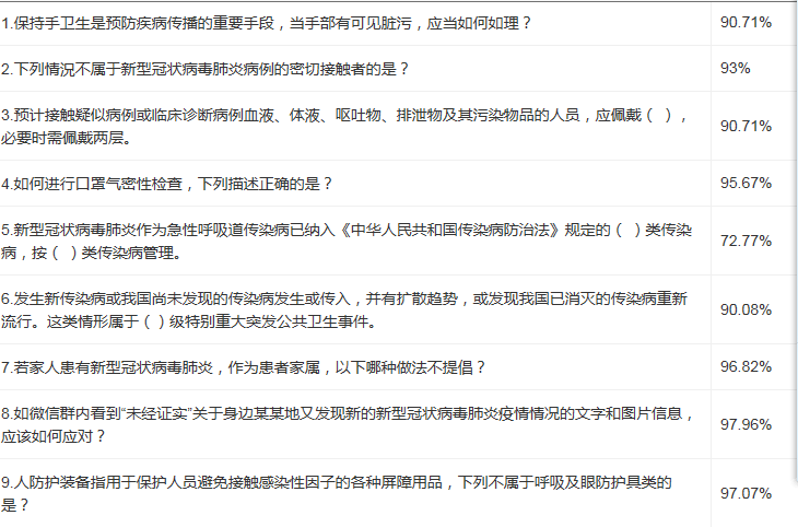 全员参与,其中4人获得满分,共计212人取得了85分以上的好成绩。竞赛问题不仅有关于新冠肺炎的基础知识,还涵盖了病毒的传播方式、感染途径以及如何预防、如何自我隔离等内容,让同学们对新冠肺炎有了科学的认识,消除了同学们对疫情不必要的恐慌。