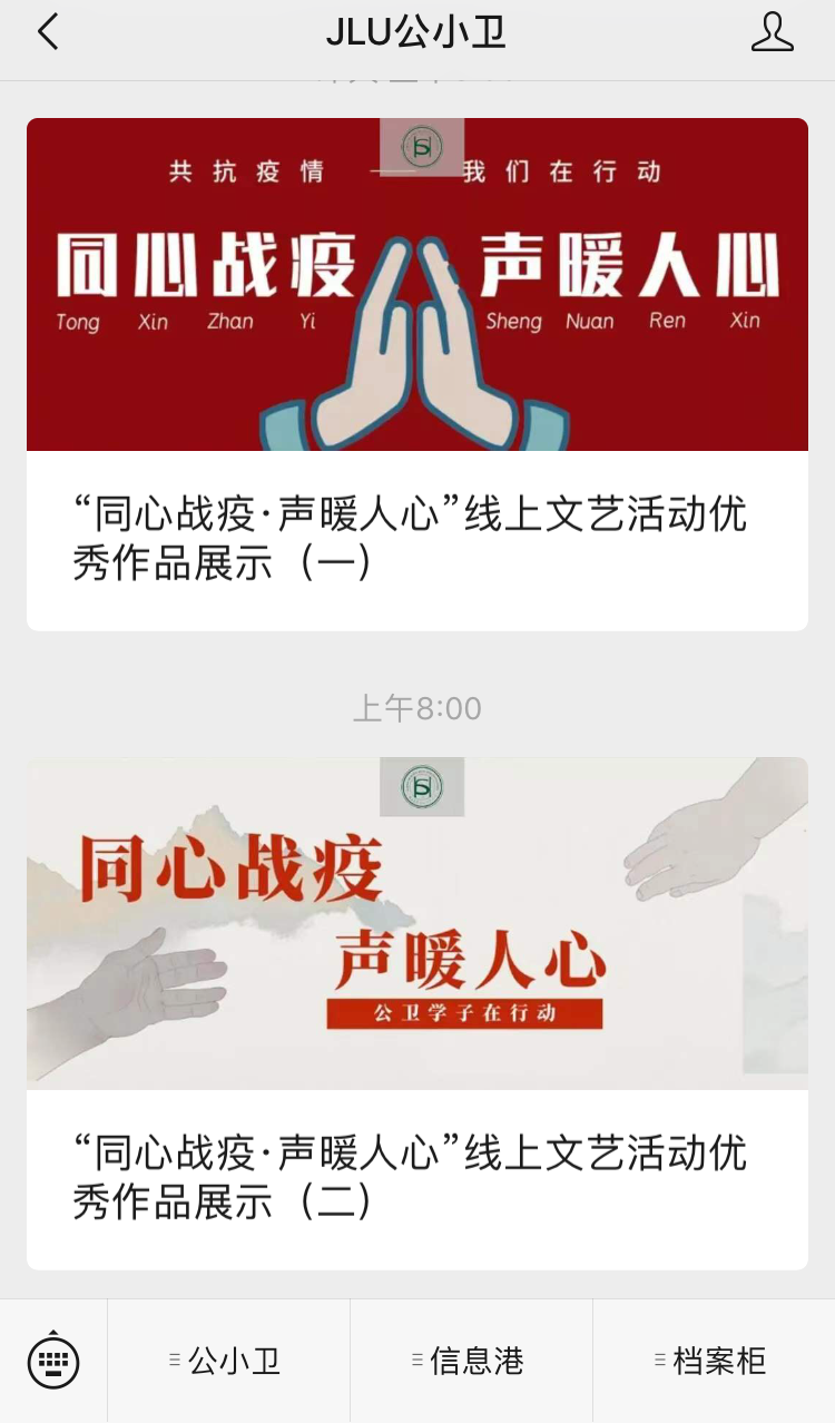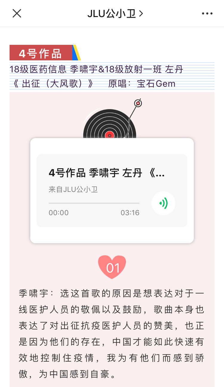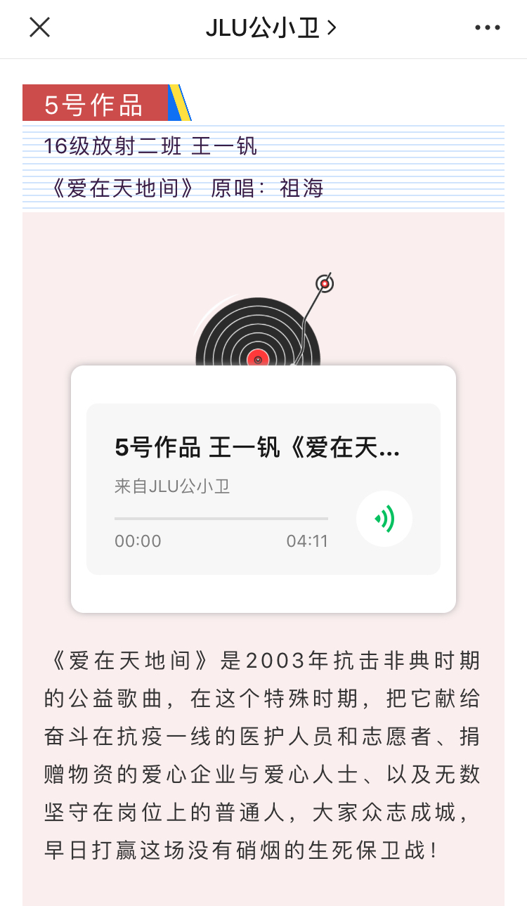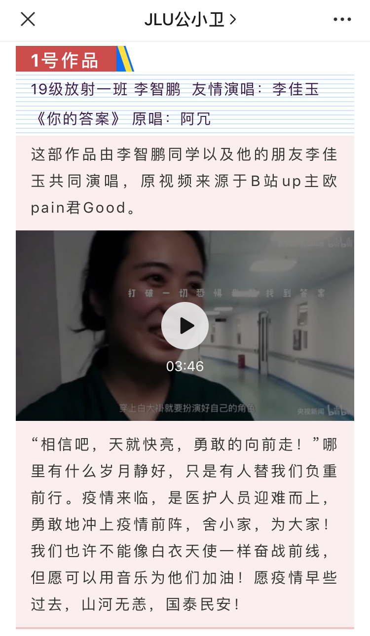 活动前期,参与报名的同学需自行选择与抗击疫情主题相关歌曲,并录制歌曲的音频视频。歌曲要求内容积极向上,符合抗疫主题,传递正能量。该活动得到了同学们的积极响应,他们热情而真诚地演绎了自己的作品。他们的歌声中无不饱含对国家、对世界战“疫”必胜的决心,对前线医护人员的敬佩和对患者的祝福。他们青春洋溢的声音正体现了抗疫战役中年轻一代的力量,展现了作为国家医疗队伍储备军的医学生的青春风采。其中,有10名同学的作品被评选为优秀作品,并在微信公众号“JLU公小卫”上进行了展示,赢得了老师和同学们的一致好评。