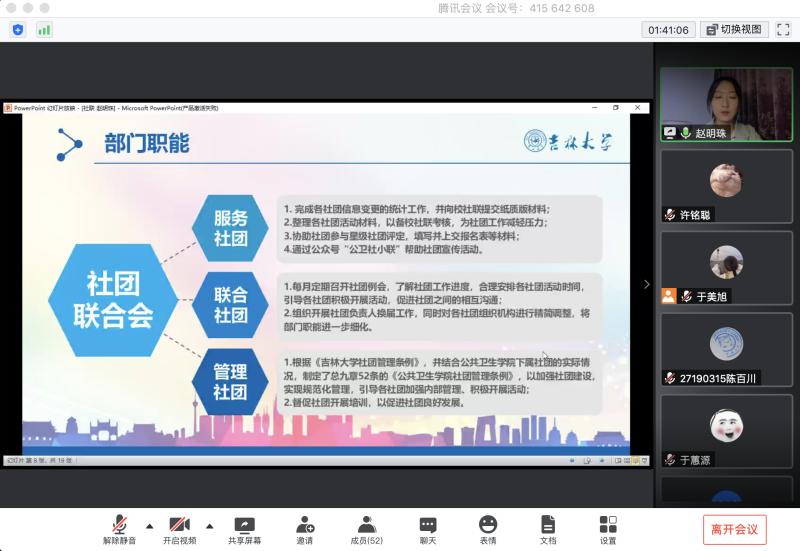 分别于5月25日和5月28日在线举行了第三十六届团学组织部长、部员换届大会。各部门参选成员从总结工作经验出发,阐述了自身优势,并对未来工作发表了展望。结合在线投票结果,经包你发