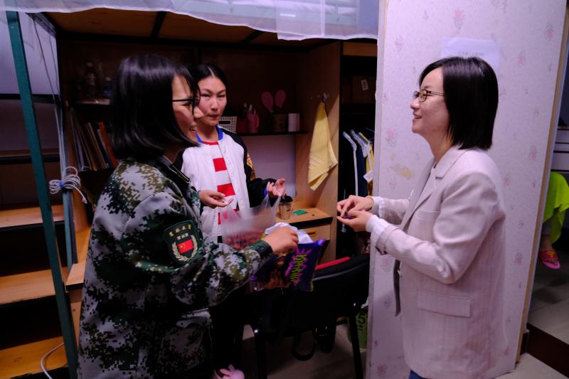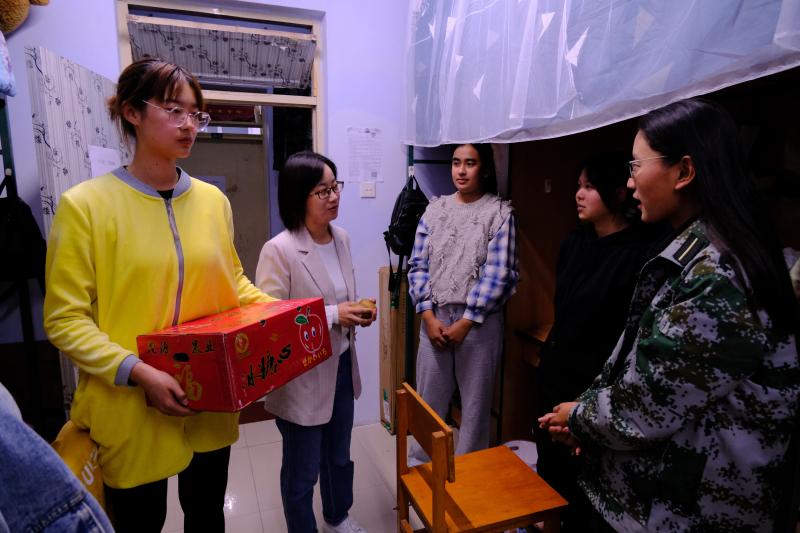 9月30日晚,冷贺璇老师与导助们带着礼物来到新生寝室,逐一走访,为新生送上精心准备的月饼和苹果,以及中秋的祝福。月饼代表喜迎中秋,苹果寓意着平安顺遂。冷老师祝大家中秋节快乐,希望大家都能在未来的日子里平平安安。收到礼物和祝福的新生们纷纷对感谢老师表达了自己的感谢之情,并同样祝福老师中秋节快乐。接着,冷老师和新生们谈论各自家乡的情况,还聊起了同学们在初入大学这段时间里的点点滴滴,说到有趣的地方,大家都笑出了声。一时间整个宿舍洋溢着节日的欢乐。最后,老师叮嘱大家近日气温多变,要注意防寒保暖。同时严格遵守疫情防控要求,中秋假期期间不要随意外出,有问题或者需要帮助的时候可以随时与老师联系。这个中秋节虽然没有家人的陪伴,但是有包你发