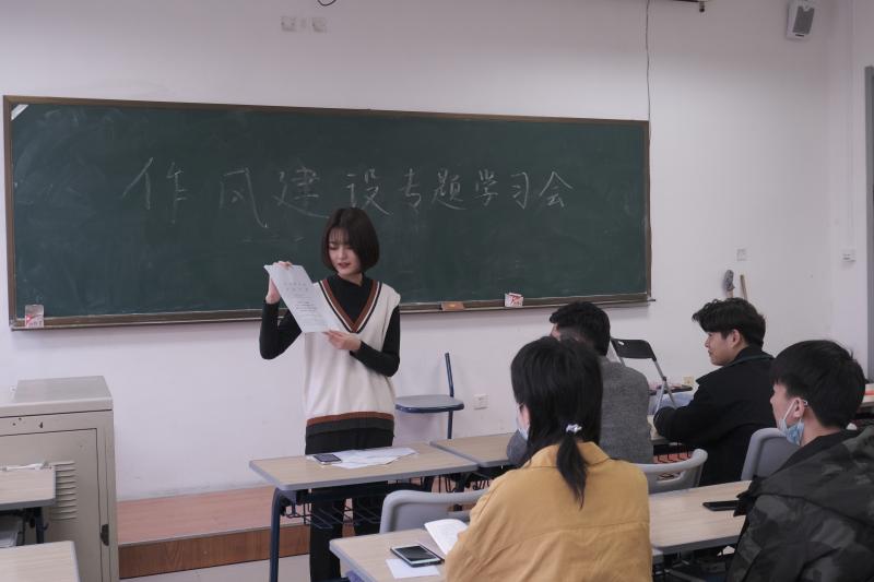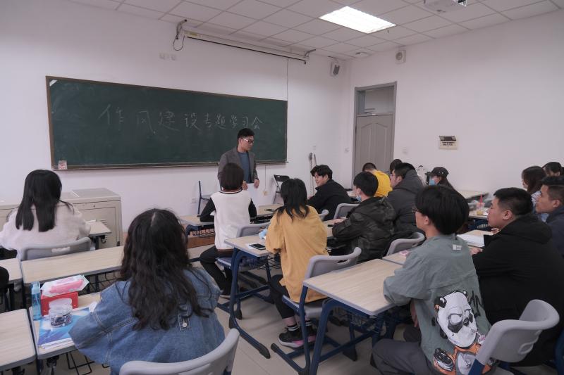 沟通,报告有关情况。对学生会工作人员的管理要求总结为六点:恪守学生本分,牢记服务宗旨,永葆理想情怀,勤勉务实做事,营造平等氛围,摒弃庸俗习气。而后,主席团成员田宏远同学以及卞骏业同学关于学生会工作人员的学习情况以及作风建设精神要求发言,希望各位工作人员能够切实做到坚守服务初心,恪守学生本分,同时以自身做好表率作用,引导同学们努力学习,不负大好时光。
