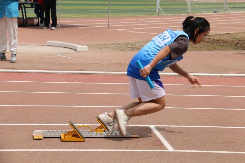 本次女子4×100米接力赛决赛于5月28日下午一点半正式开始。位于1组5道的四名同学检录后提前到场,做好充分的热身训练,在指定位置预先设想好交接动作,争取又快又准地完成接力棒的交接。随着裁判一声枪响,一号选手周陈佳冲了出去。观众席上的鼓声不断、加油声不断。选手的热情也被这氛围点燃,一步一步地向前跑去,同时也不忘呼吸与频率的协调。在一百米即将结束时,周陈佳伸出拿着接力棒的手,二号选手初加仪也提前做好准备姿势。一根接力棒,是活动道具,更是不同人两只手同时握住的责任、无声鼓励。没有犹豫,初加仪冲了出去。然后是三号选手李昕如,四号选手韦海玉。红色的跑道承载着运动员的汗水与泪水,她们置身于此情境中,一心只有白色的终点线。跑过终点线,才又回归现实,收获观众们的喝彩声。包你发