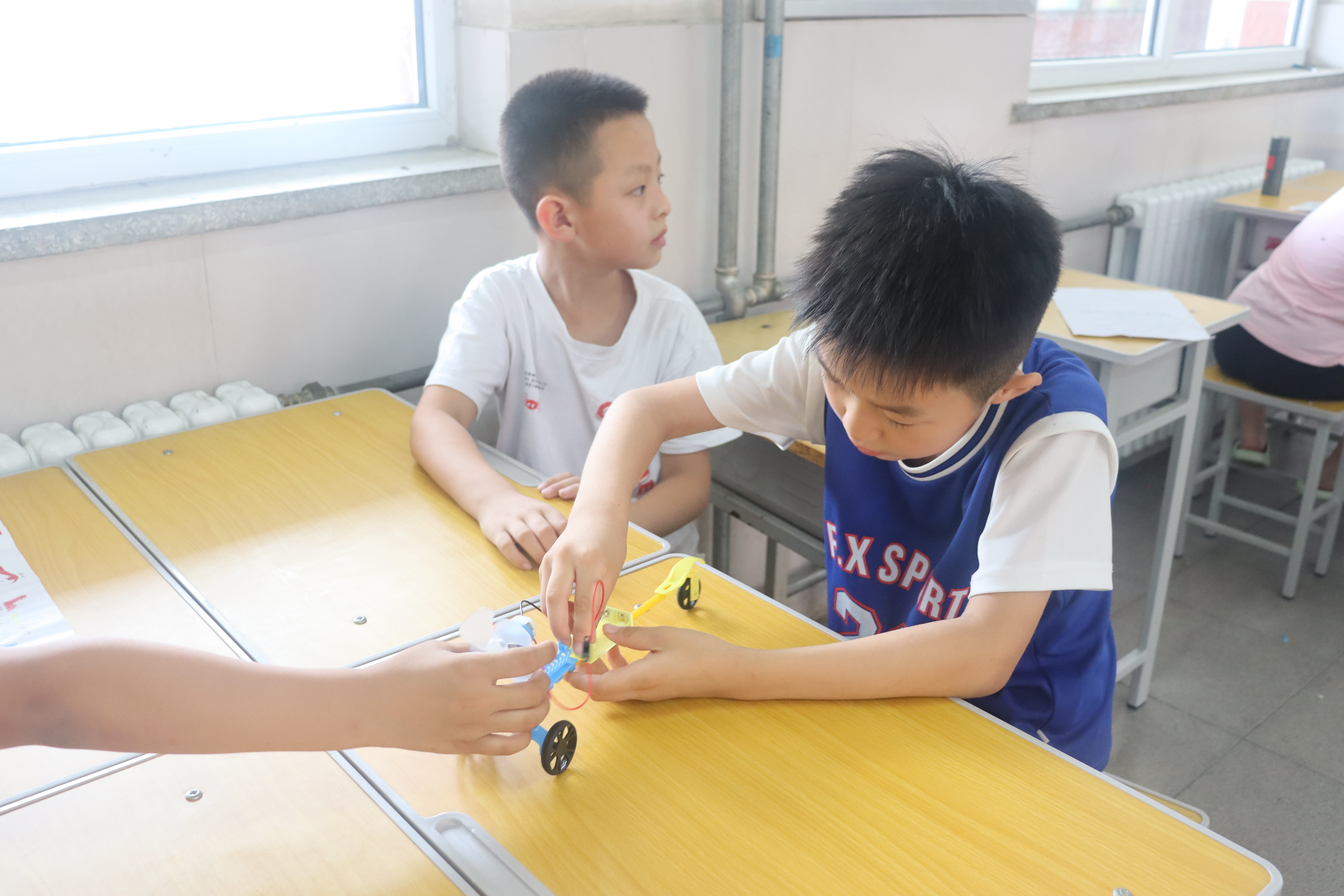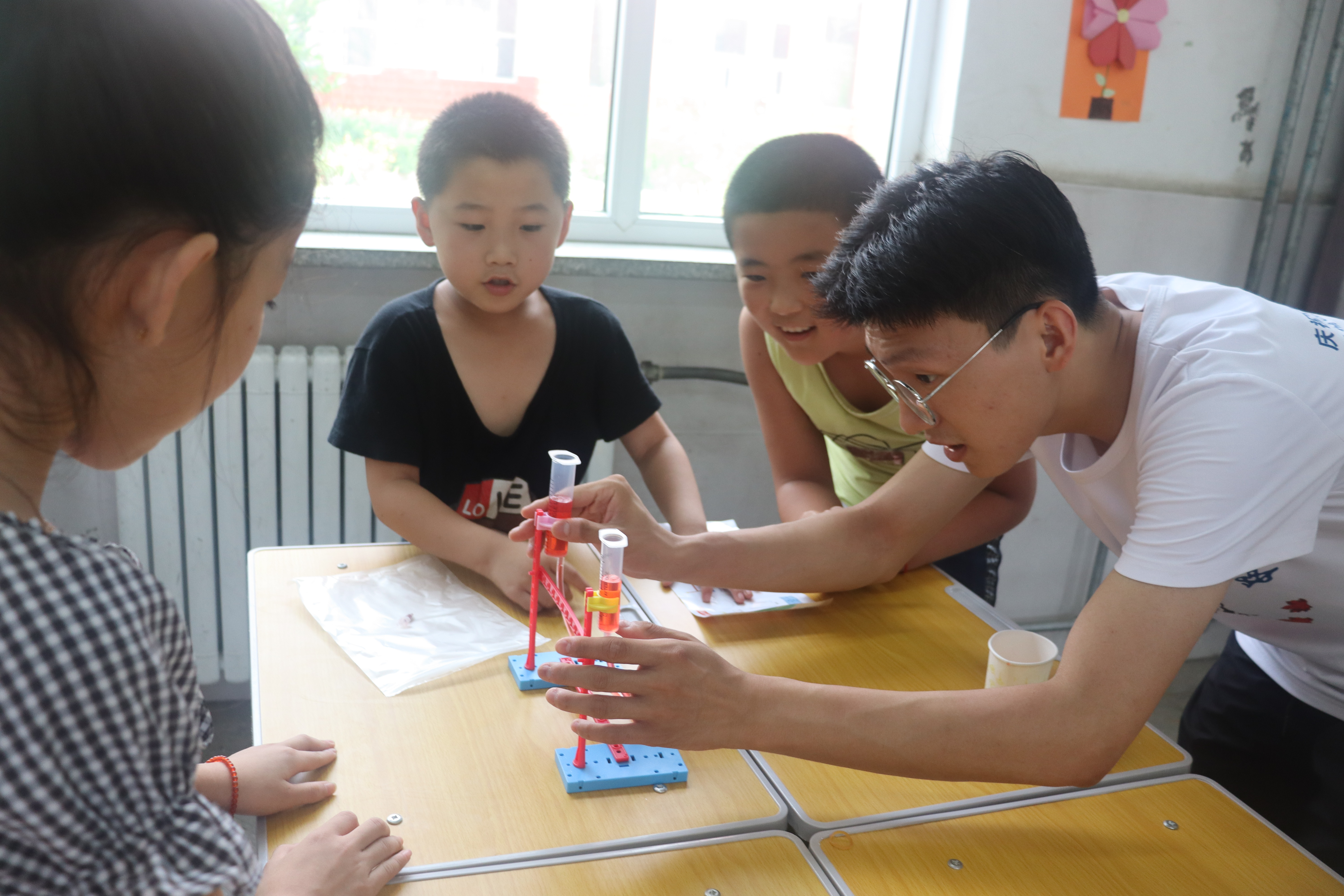 下午的另一部分是科学课。志愿者们给孩子们分发准备好的科学实验备品供孩子们自行制作,制作完成后让孩子们自己上讲台讲述原理,充分发挥了孩子们的主观能动性。