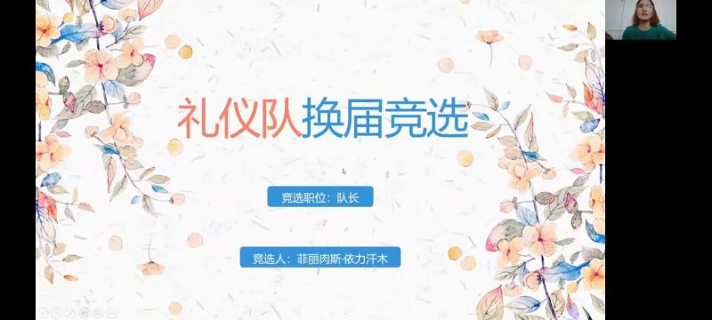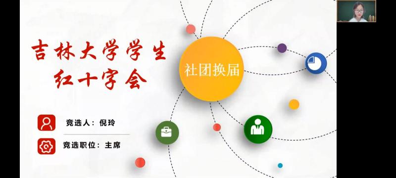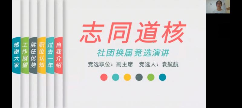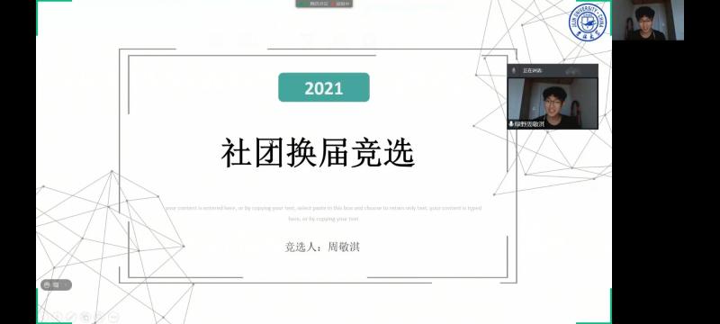 首先,由主持人宋雅萌和张晶介绍到场嘉宾并且介绍竞选规则。随后各个社团主席、队长竞选人员按照先定顺序依次打开屏幕共享配合PPT进行竞职演讲。竞选者们大多从个人简介,工作经历,个人优势和未来展望四个方面展开演讲。每位竞选者的演讲都十分精彩,他们回顾了过去一年在包你发