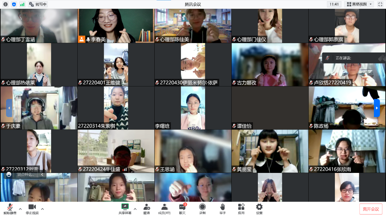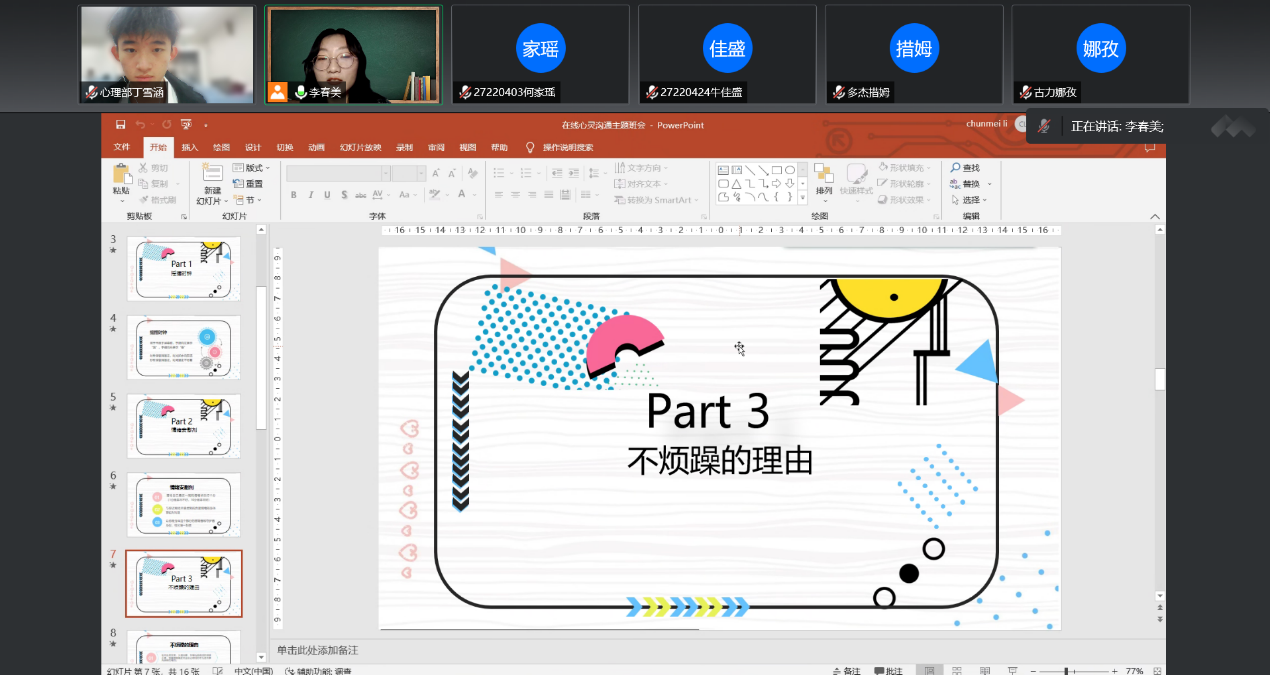 此次心理班会共分为三个阶段:暖身阶段、讨论阶段和结束阶段。在暖身阶段心理部准备了“摇摆时钟”活动和“脑筋急转弯”“听歌识曲”等热身小游戏,旨在让同学们放松心情,使大家身体和大脑迅速动起来,同学们也都积极参与进来,班会氛围轻松活跃。在讨论阶段准备了“情绪安慰剂”、“不烦躁的理由”、“我的一天”等讨论活动,在此阶段大家针对疫情期间的困扰、升入大学以来的不习惯以及学习生活中的计划安排进行了讨论,旨在帮助同学们解决大学生活中的烦恼困惑,让同学们学会更合理的日常安排,在学习生活中更加游刃有余。在最后的结束阶段,助手公布热身游戏环节获奖学生名单,并对其进行表扬。班会中,主持人也给同学们介绍了包你发